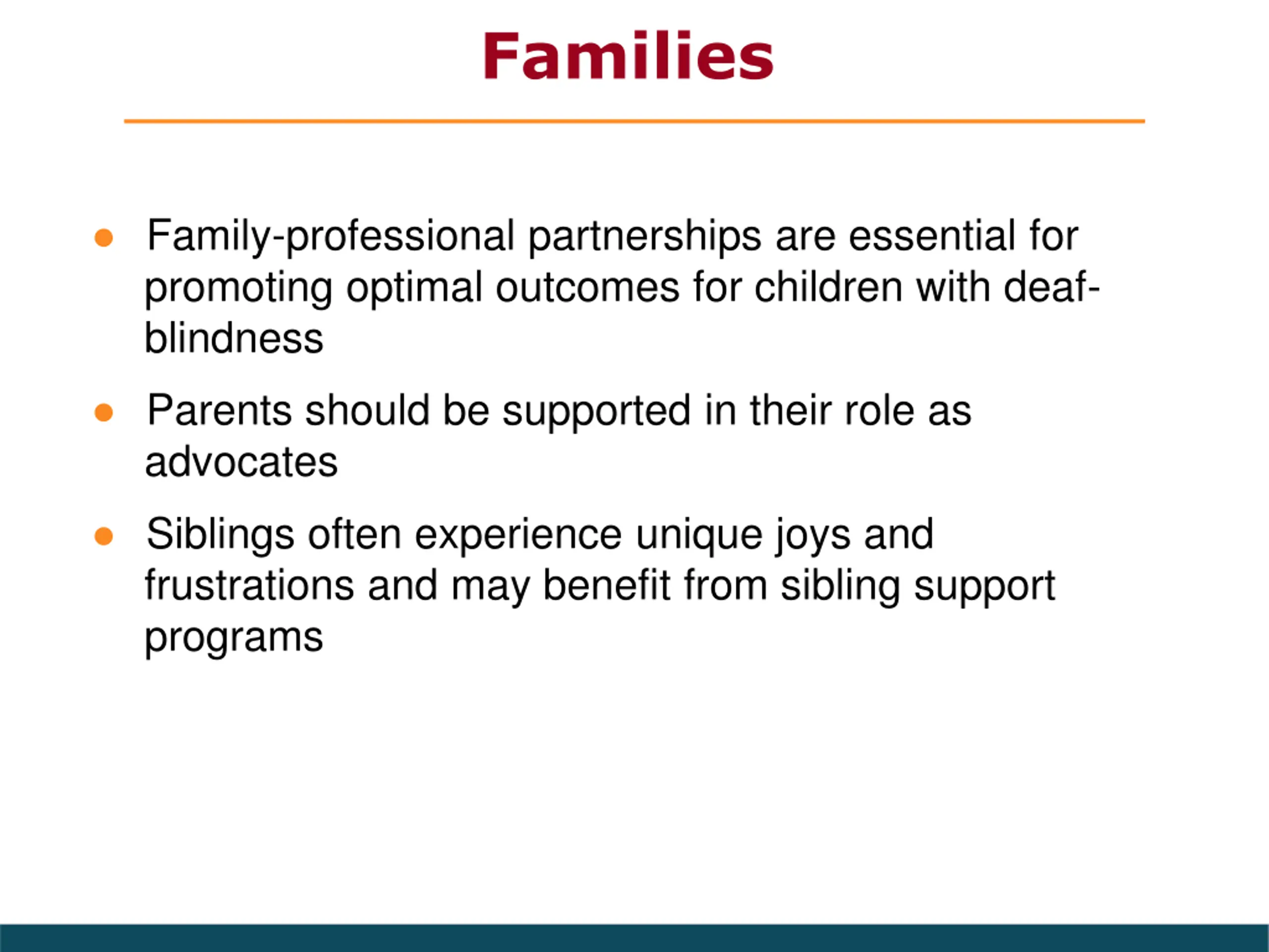 Families Family-professional partnerships are essential for promoting optimal outcomes for children with deaf- blindness Parents should be supported in their role as advocates Siblings often experience unique joys and frustrations and may benefit from sibling support programs