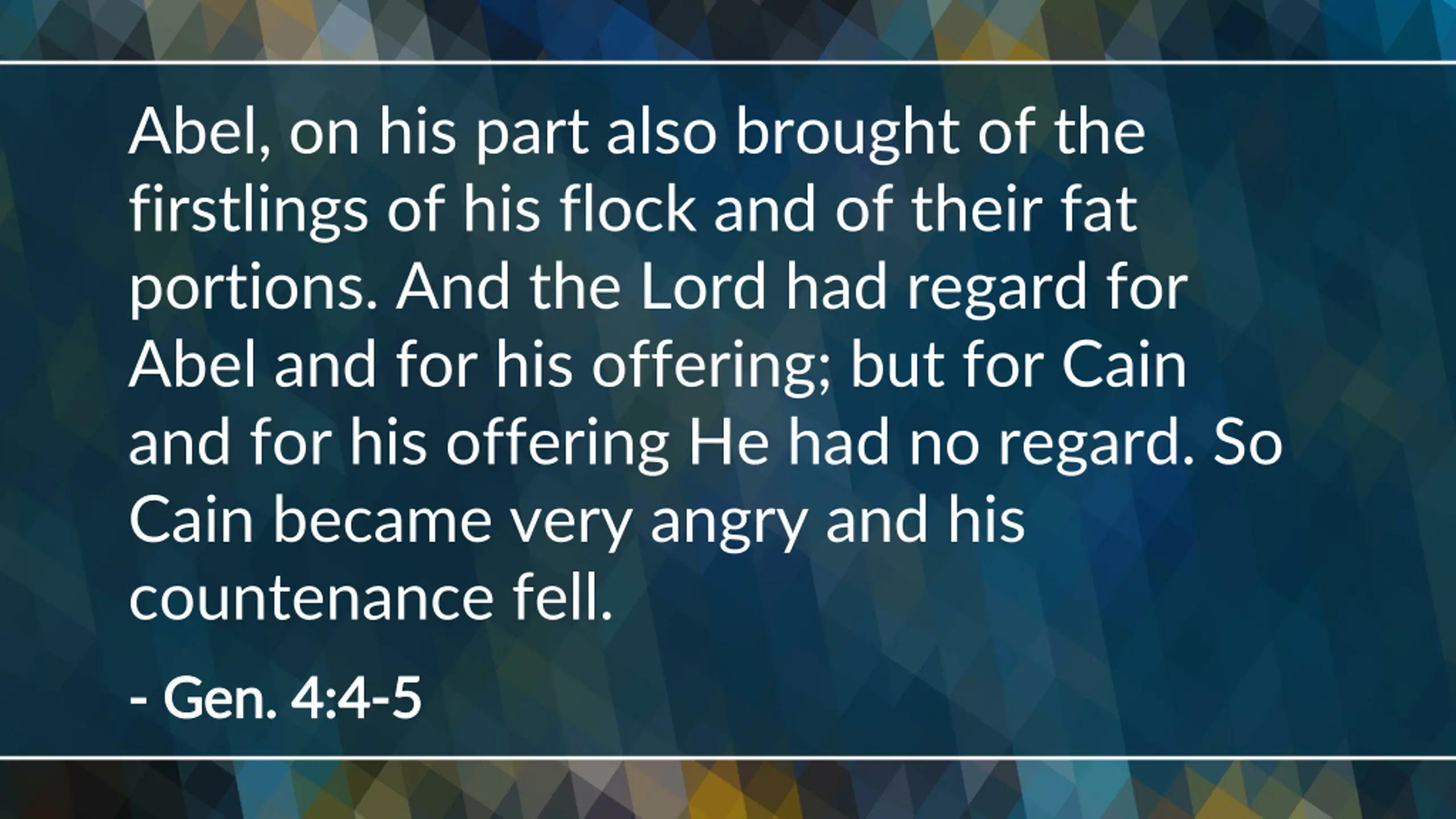 Abel, on his part also brought of the firstlings of his flock and of their fat portions. And the Lord had regard for Abel and for his offering; but for Cain and for his offering He had no regard. So Cain became very angry and his countenance fell. - - Gen. 4:4 Gen. 4:4- -5 5