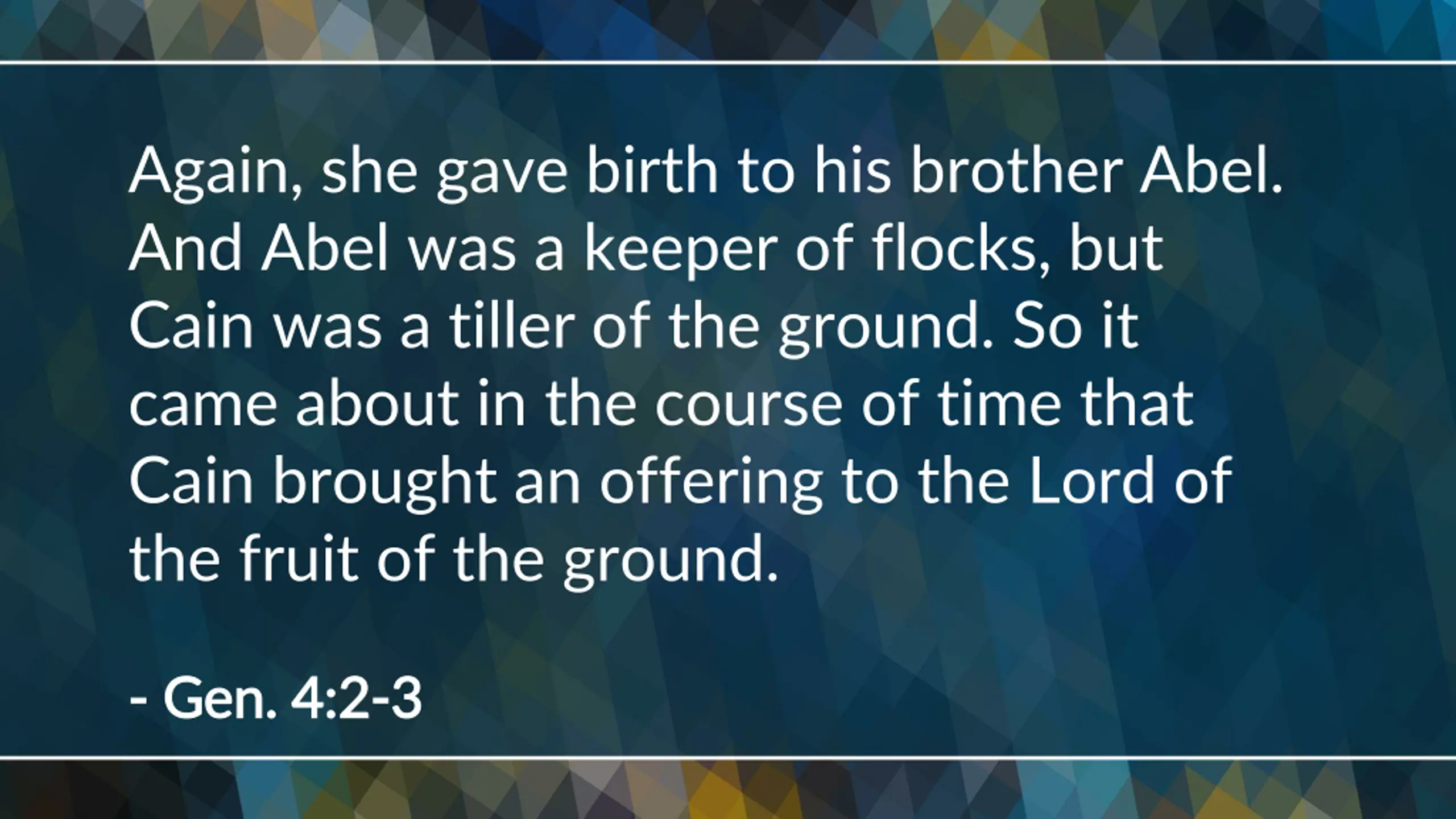 Again, she gave birth to his brother Abel. And Abel was a keeper of flocks, but Cain was a tiller of the ground. So it came about in the course of time that Cain brought an offering to the Lord of the fruit of the ground. - - Gen. 4:2 Gen. 4:2- -3 3