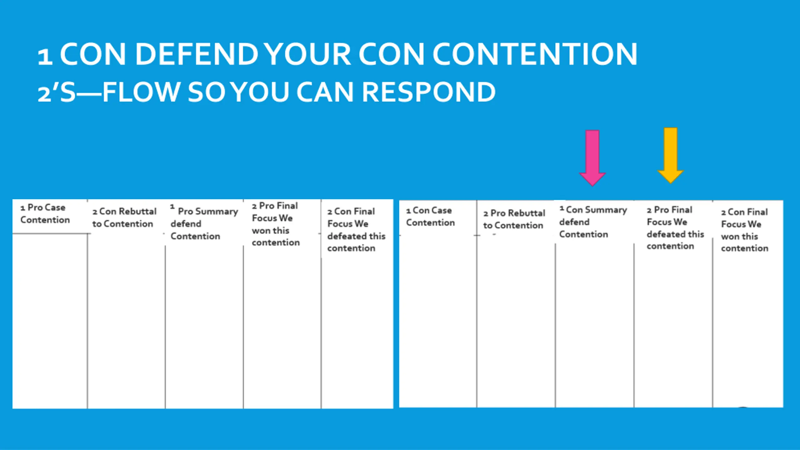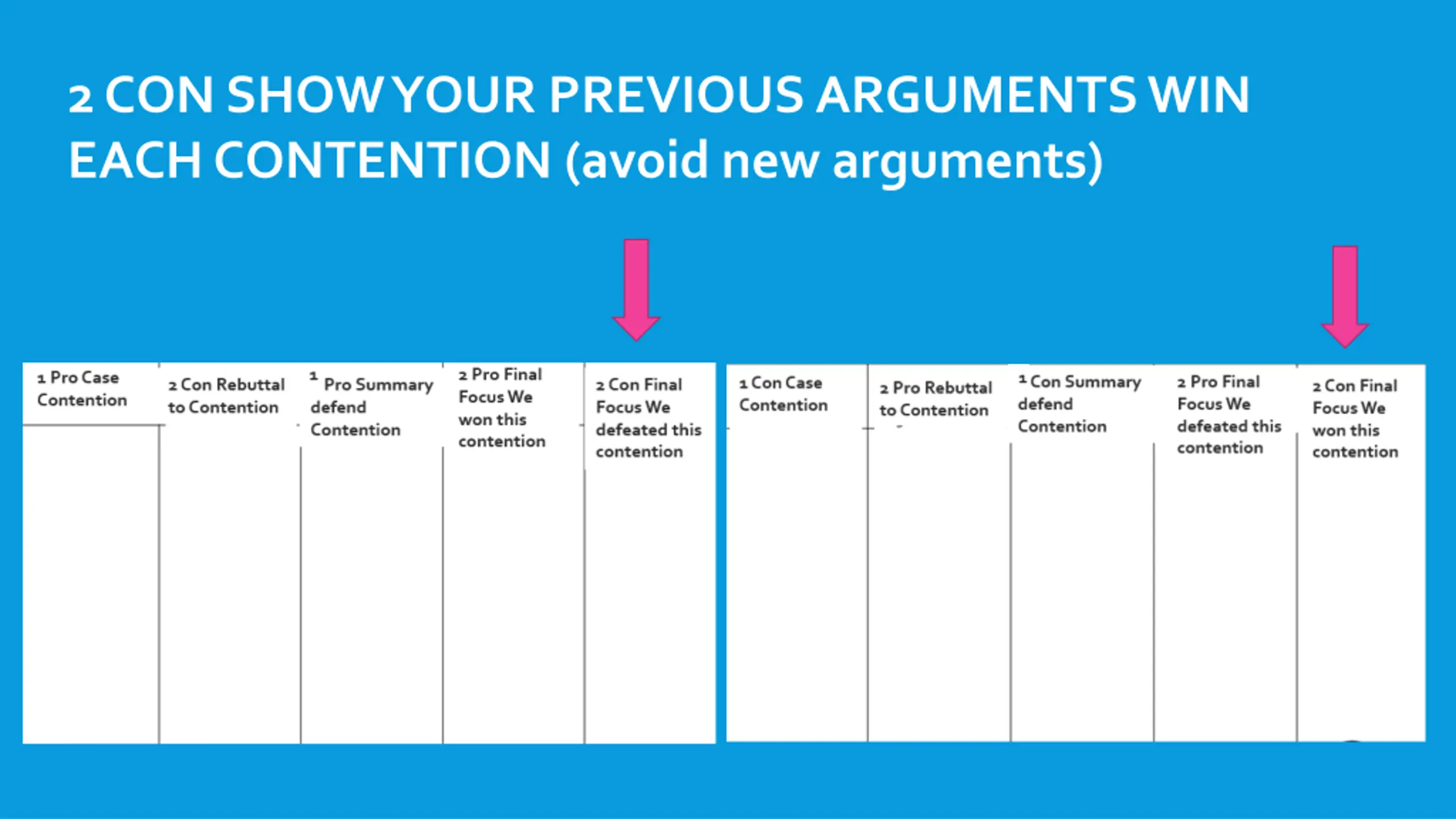 2 CON SHOW YOUR PREVIOUS ARGUMENTS WIN EACH CONTENTION (avoid new arguments)