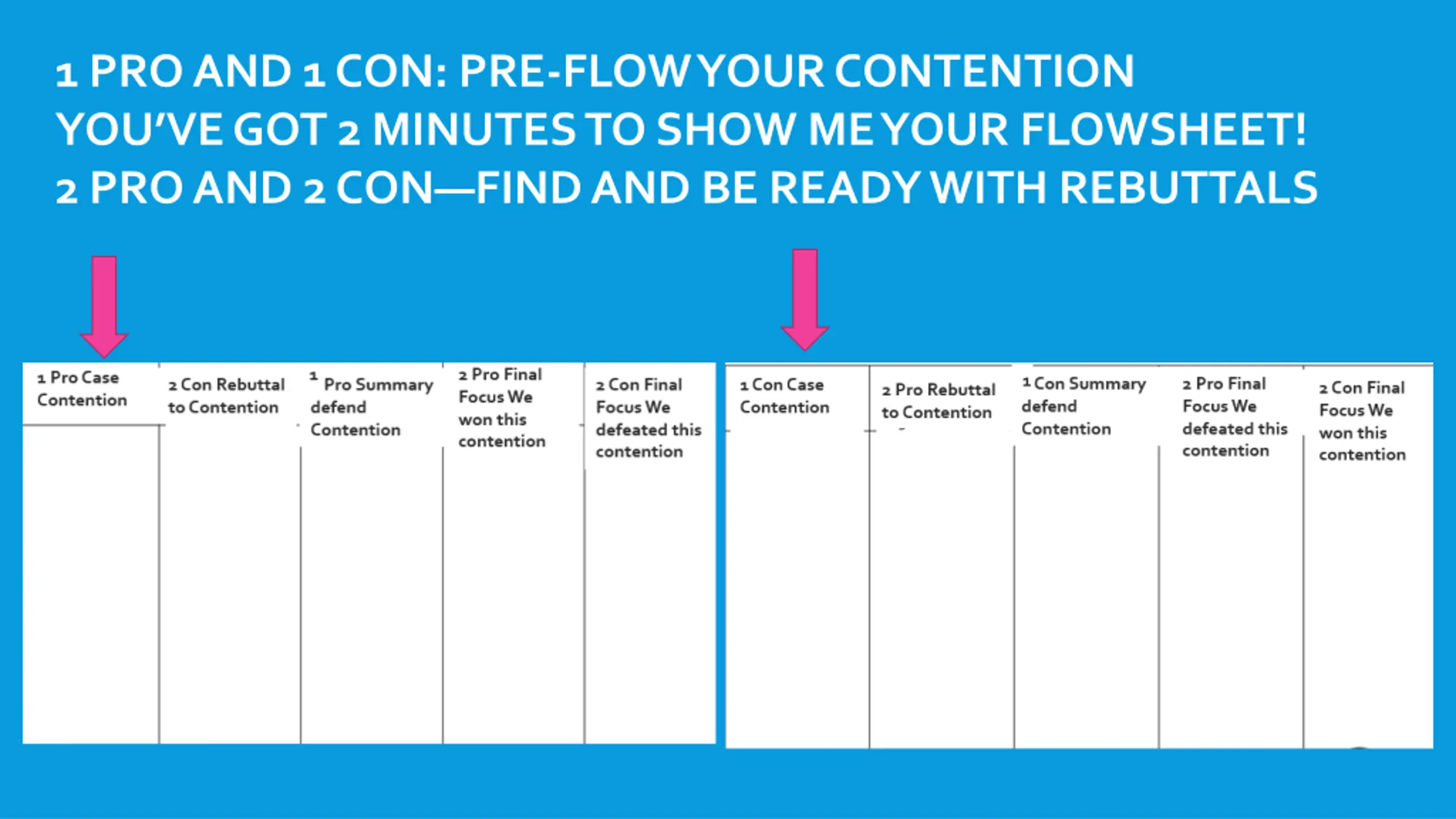 1 PRO AND 1 CON: PRE-FLOW YOUR CONTENTION YOU VE GOT 2 MINUTES TO SHOW ME YOUR FLOWSHEET! 2 PRO AND 2 CON FIND AND BE READY WITH REBUTTALS 1