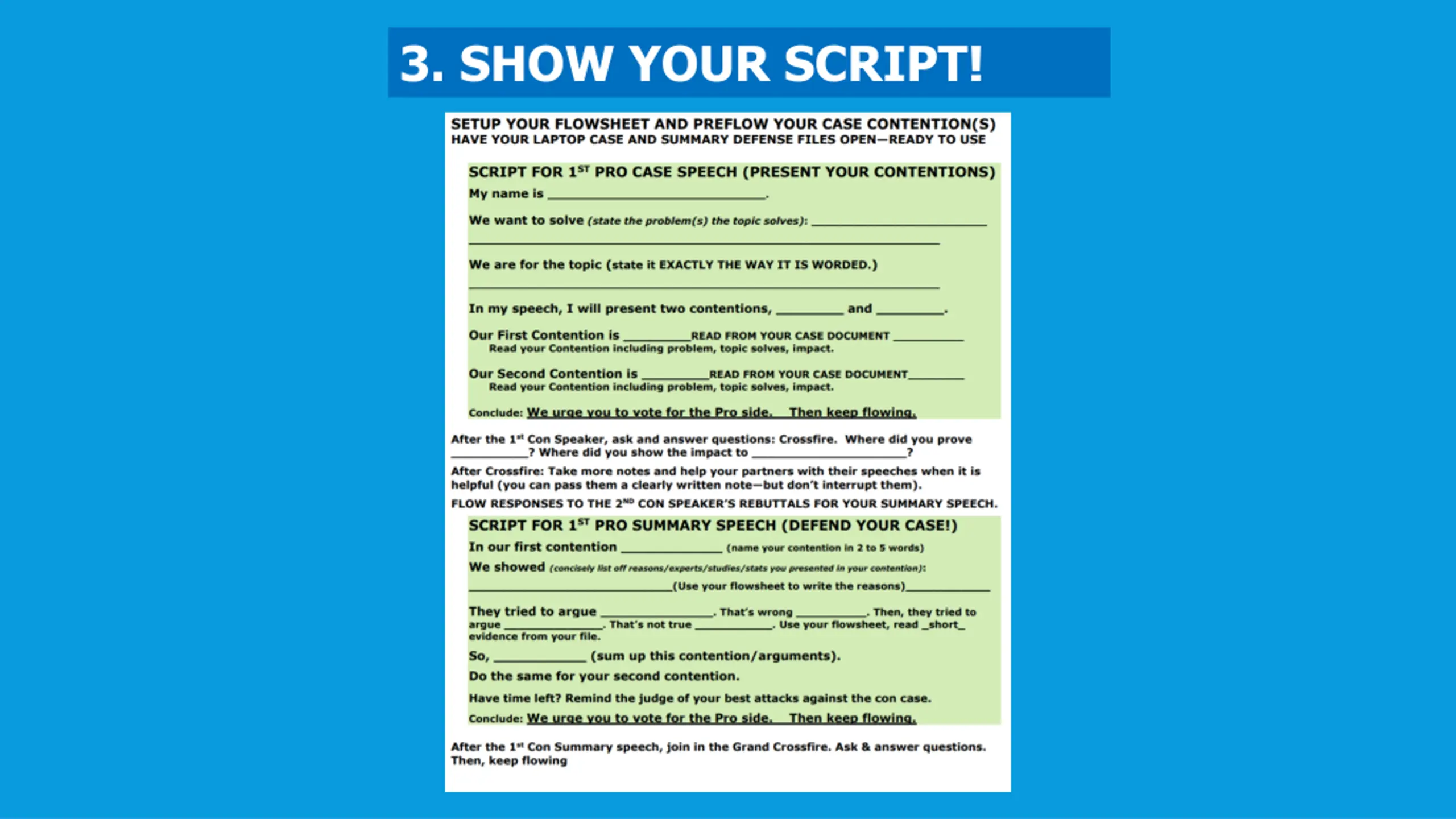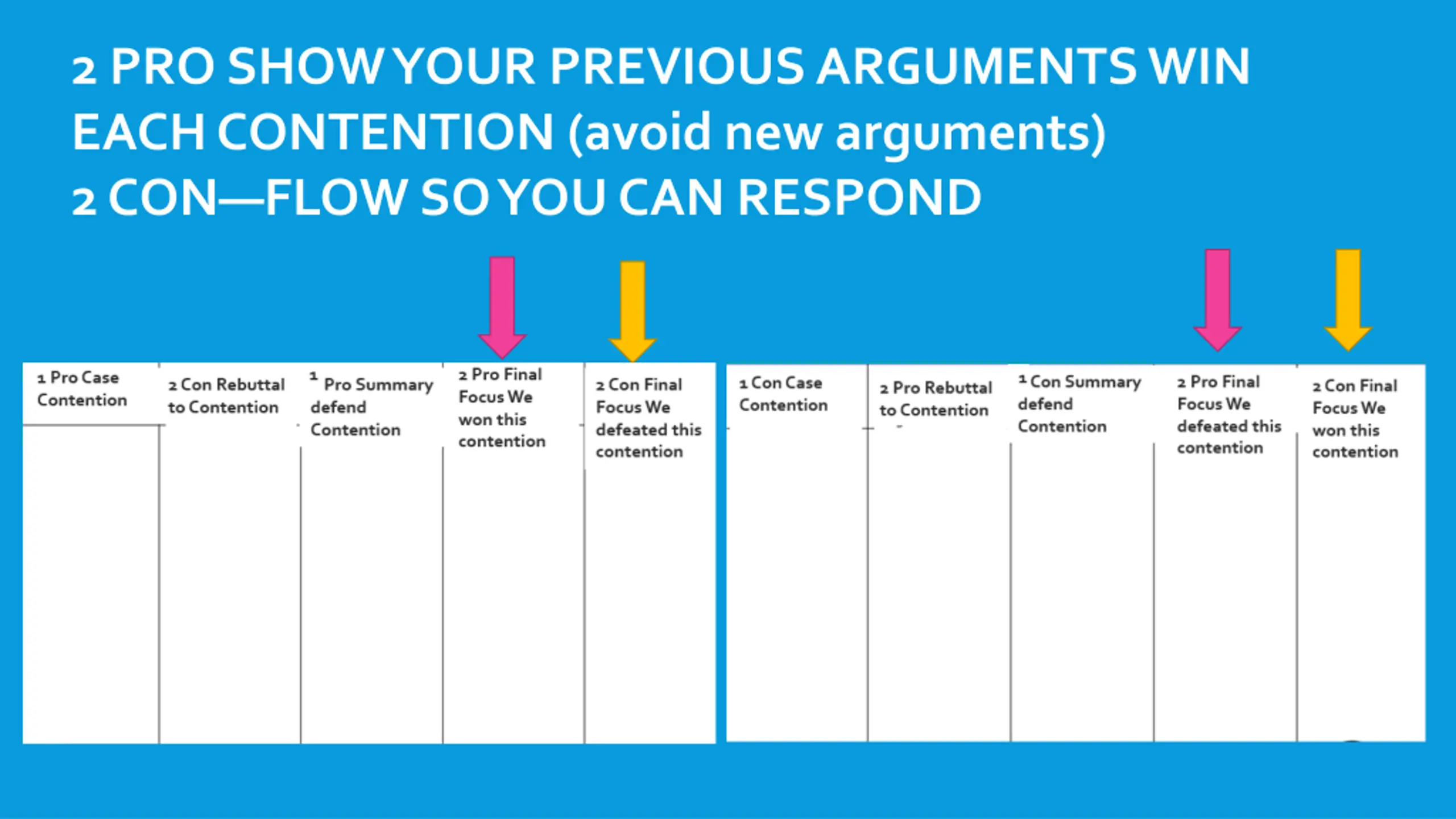 2 PRO SHOW YOUR PREVIOUS ARGUMENTS WIN EACH CONTENTION (avoid new arguments) 2 CON FLOW SO YOU CAN RESPOND
