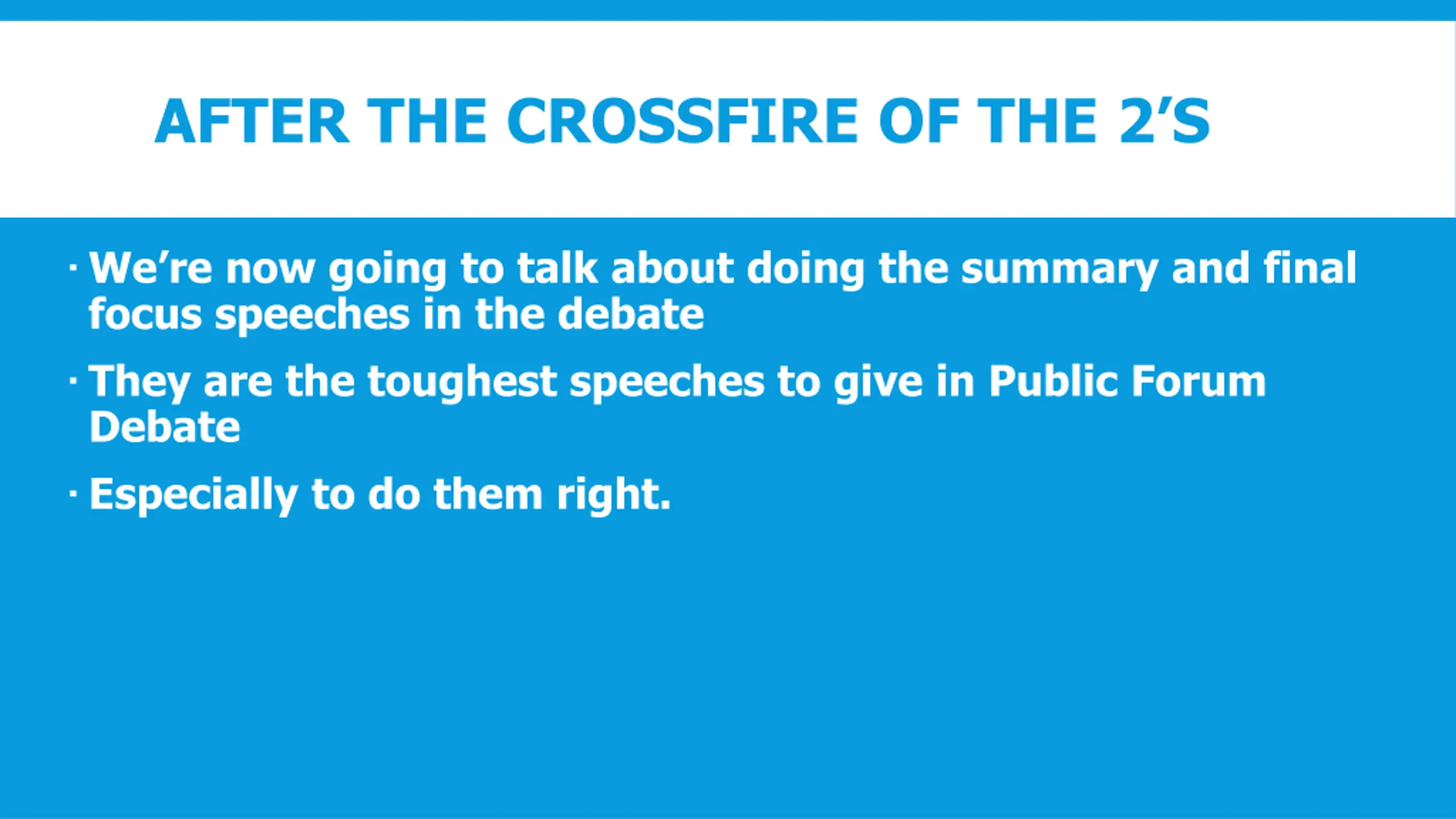 AFTER THE CROSSFIRE OF THE 2S We re now going to talk about doing the summary and final focus speeches in the debate They are the toughest speeches to give in Public Forum Debate Especially to do them right.