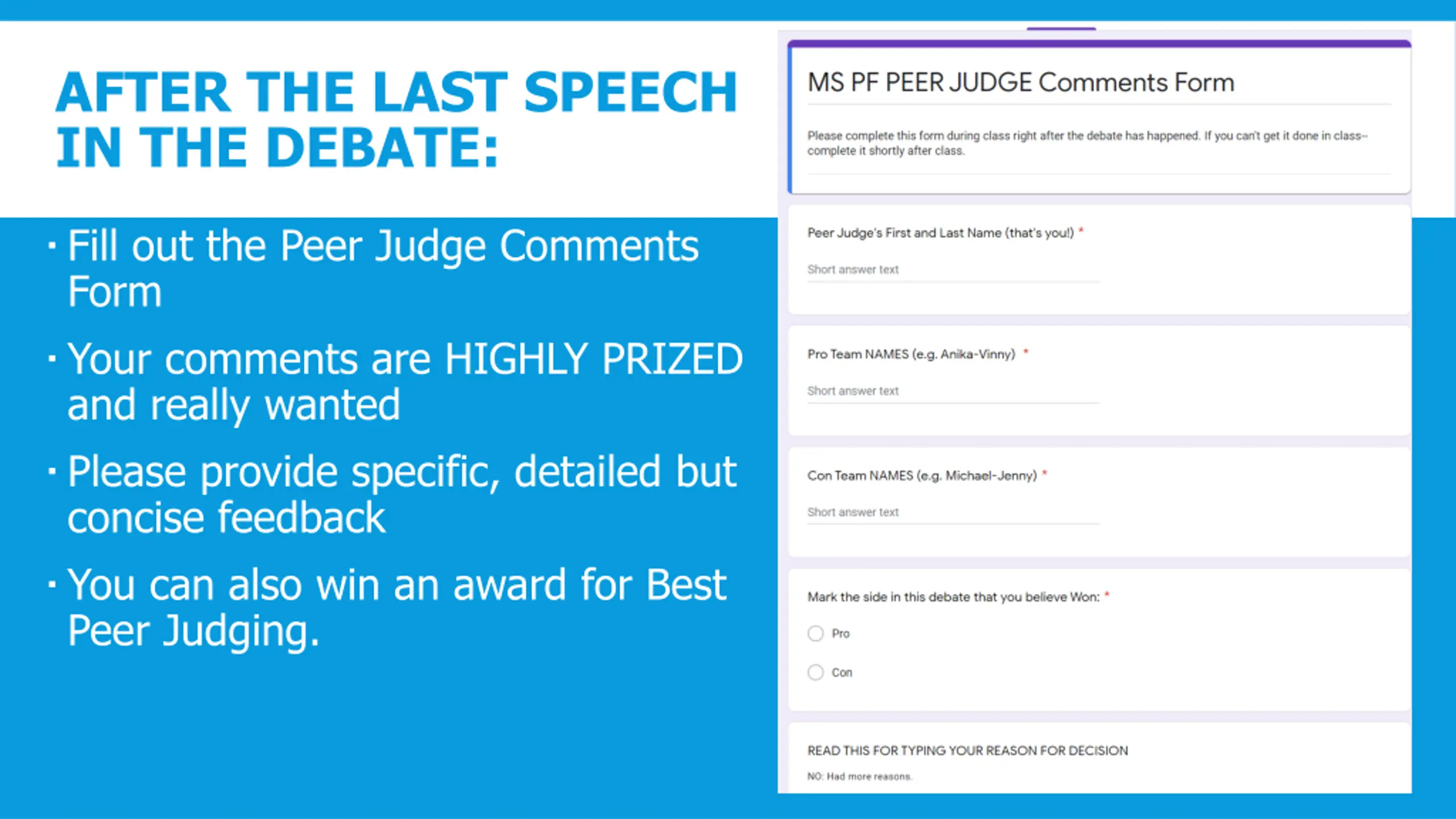 AFTER THE LAST SPEECH IN THE DEBATE: Fill out the Peer Judge Comments Form Your comments are HIGHLY PRIZED and really wanted Please provide specific, detailed but concise feedback You can also win an award for Best Peer Judging.