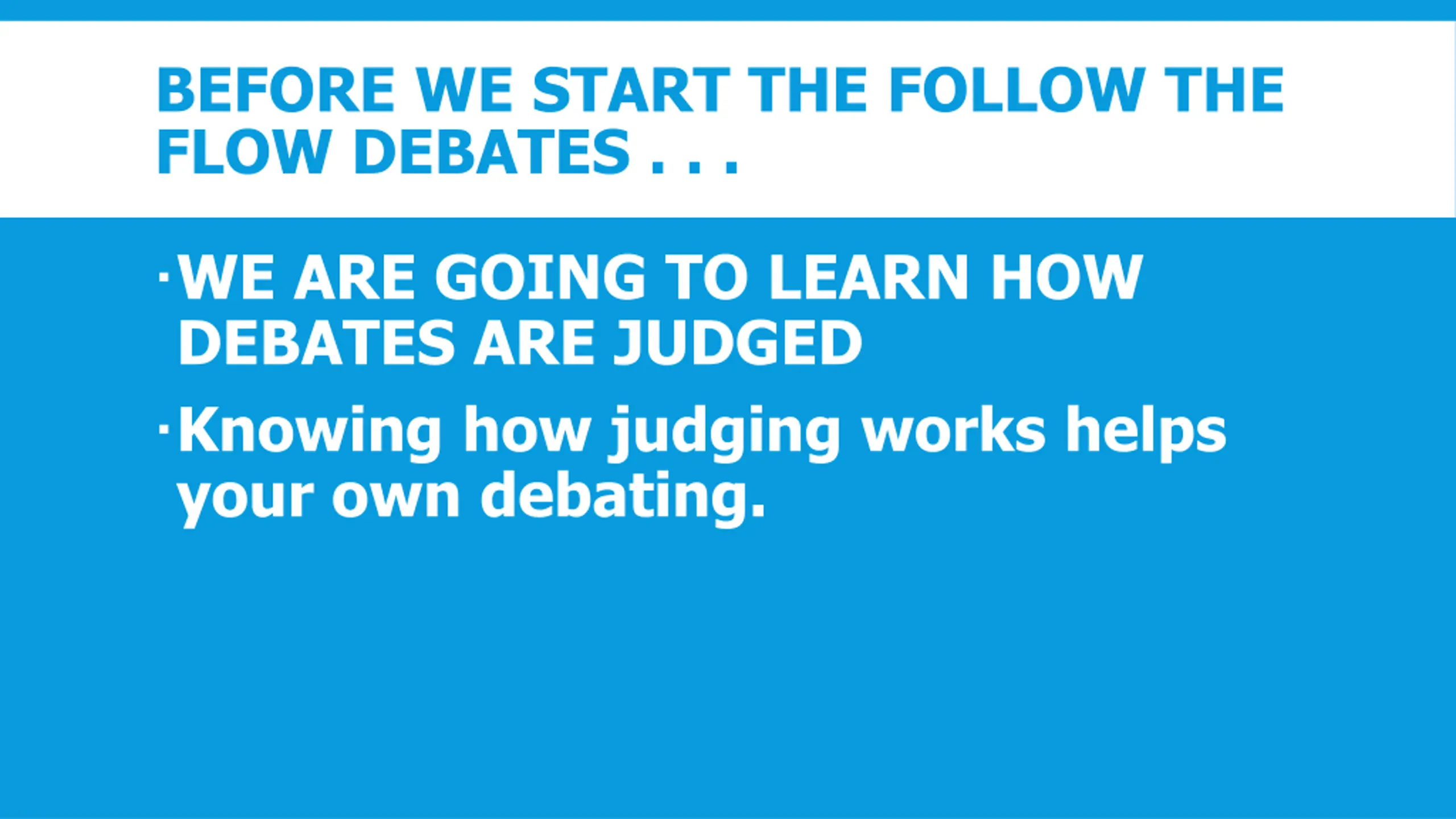 BEFORE WE START THE FOLLOW THE FLOW DEBATES . . . WE ARE GOING TO LEARN HOW DEBATES ARE JUDGED Knowing how judging works helps your own debating.