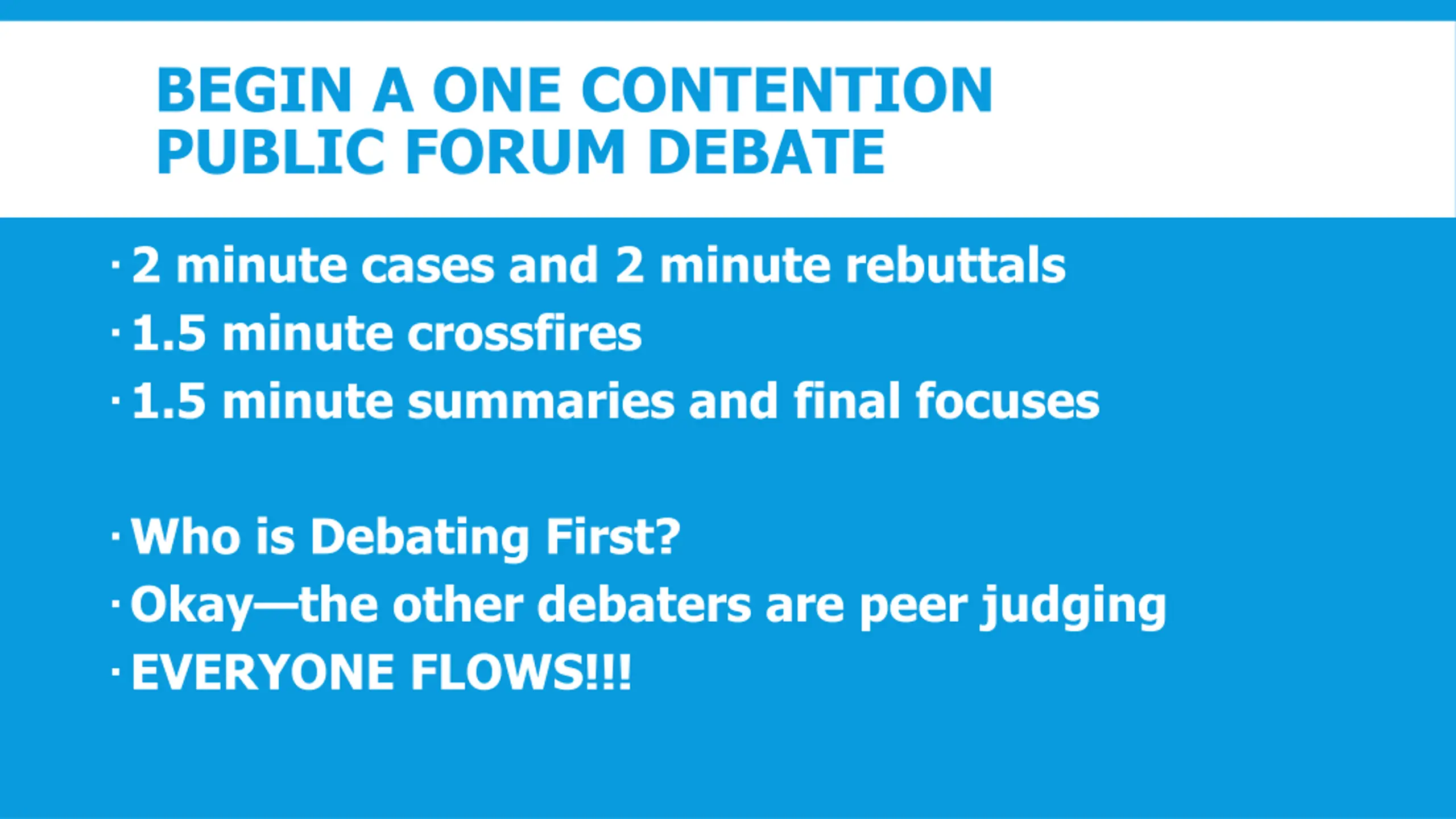 BEGIN A ONE CONTENTION PUBLIC FORUM DEBATE 2 minute cases and 2 minute rebuttals 1.5 minute crossfires 1.5 minute summaries and final focuses Who is Debating First? Okay the other debaters are peer judging EVERYONE FLOWS!!!