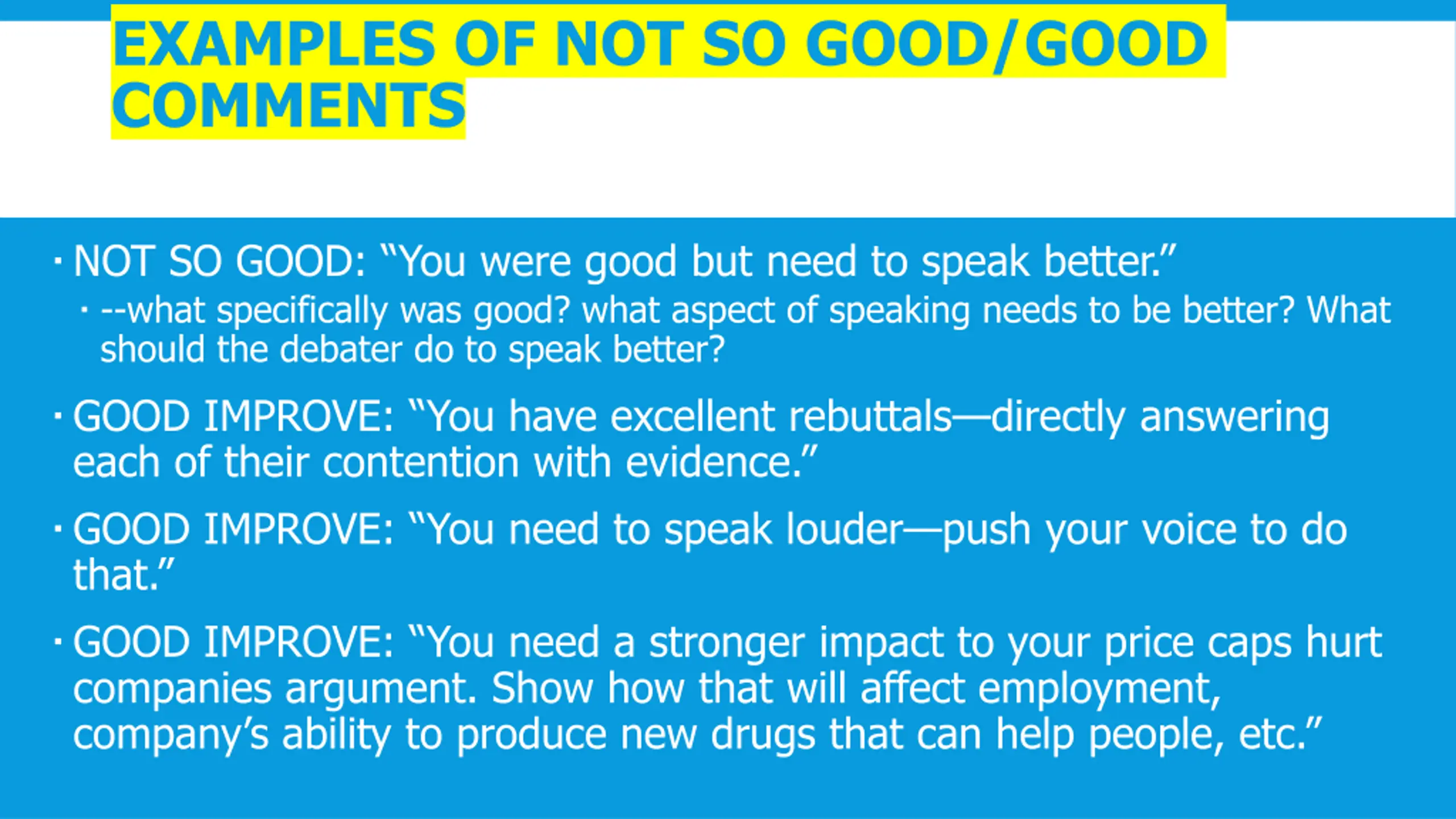 EXAMPLES OF NOT SO GOOD/GOOD COMMENTS NOT SO GOOD: You were good but need to speak better. --what specifically was good? what aspect of speaking needs to be better? What should the debater do to speak better? GOOD IMPROVE: You have excellent rebuttals directly answering each of their contention with evidence. GOOD IMPROVE: You need to speak louder push your voice to do that. GOOD IMPROVE: You need a stronger impact to your price caps hurt companies argument. Show how that will affect employment, company s ability to produce new drugs that can help people, etc.