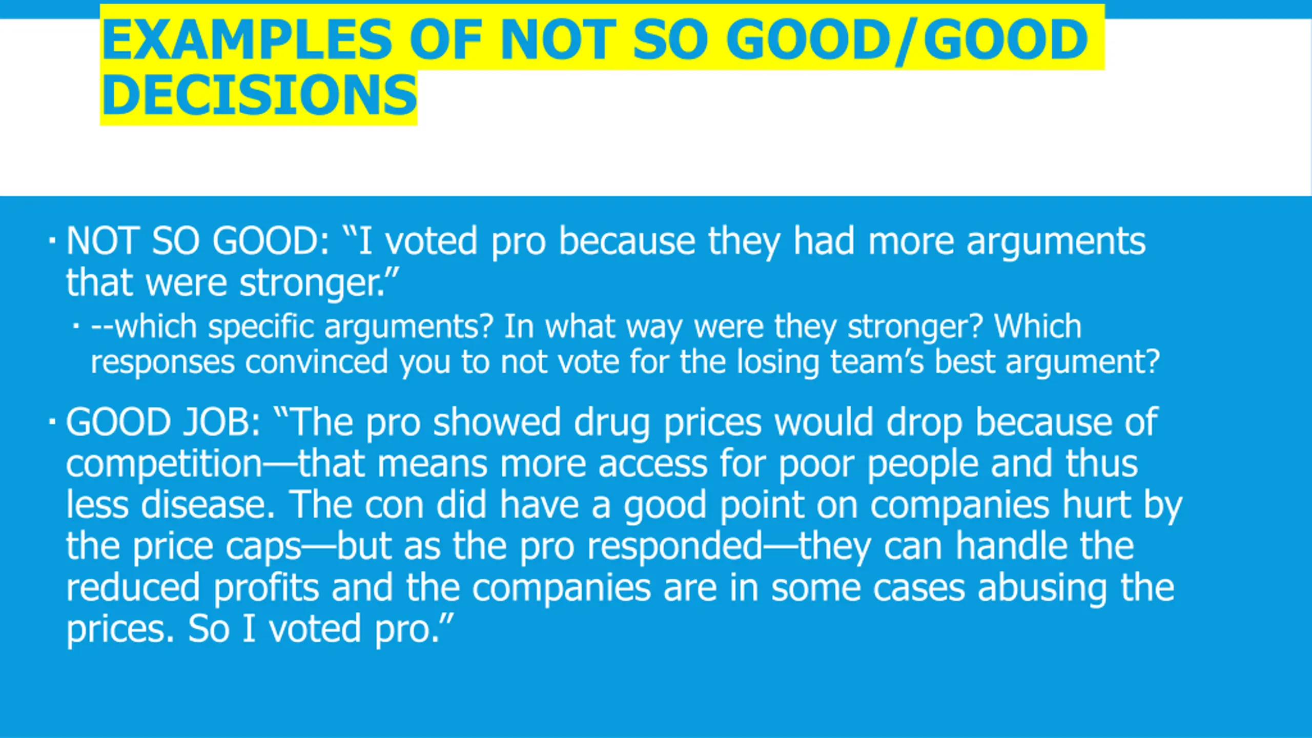 EXAMPLES OF NOT SO GOOD/GOOD DECISIONS NOT SO GOOD: I voted pro because they had more arguments that were stronger. --which specific arguments? In what way were they stronger? Which responses convinced you to not vote for the losing team s best argument? GOOD JOB: The pro showed drug prices would drop because of competition that means more access for poor people and thus less disease. The con did have a good point on companies hurt by the price caps but as the pro responded they can handle the reduced profits and the companies are in some cases abusing the prices. So I voted pro.