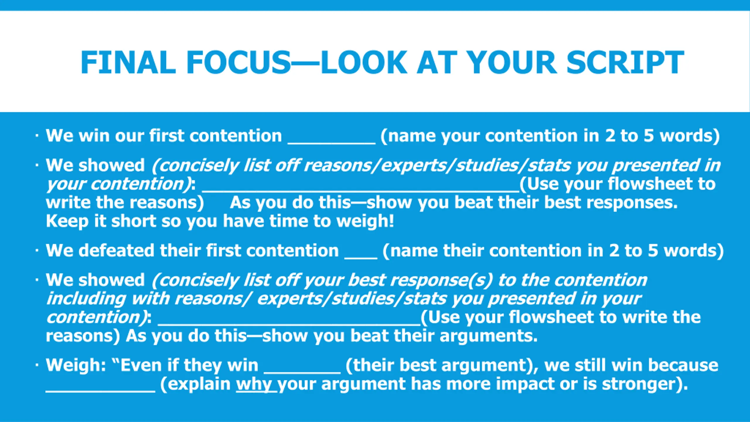 FINAL FOCUSLOOK AT YOUR SCRIPT We win our first contention ________ (name your contention in 2 to 5 words) We showed (concisely list off reasons/experts/studies/stats you presented in your contention): _____________________________(Use your flowsheet to write the reasons) As you do this show you beat their best responses. Keep it short so you have time to weigh! We defeated their first contention ___ (name their contention in 2 to 5 words) We showed (concisely list off your best response(s) to the contention including with reasons/ experts/studies/stats you presented in your contention): ________________________(Use your flowsheet to write the reasons) As you do this show you beat their arguments. Weigh: Even if they win _______ (their best argument), we still win because __________ (explain why your argument has more impact or is stronger).
