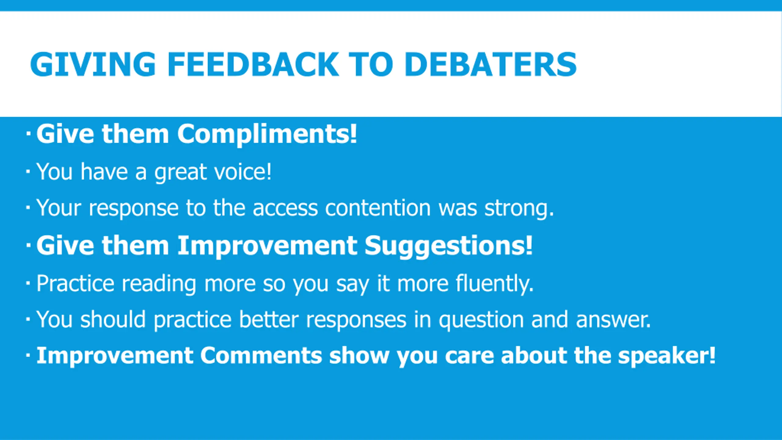 GIVING FEEDBACK TO DEBATERS Give them Compliments! You have a great voice! Your response to the access contention was strong. Give them Improvement Suggestions! Practice reading more so you say it more fluently. You should practice better responses in question and answer. Improvement Comments show you care about the speaker!