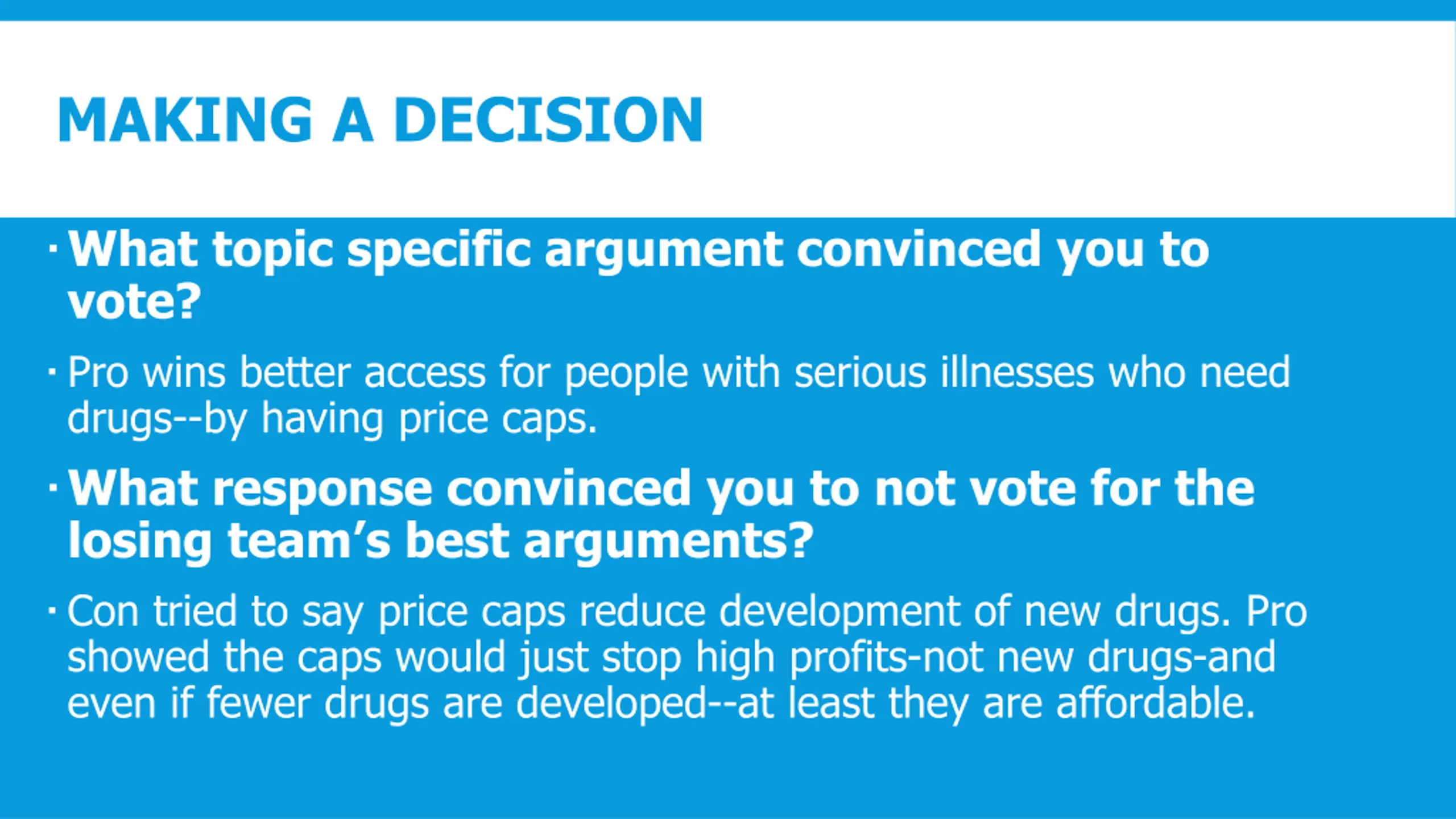 MAKING A DECISION What topic specific argument convinced you to vote? Pro wins better access for people with serious illnesses who need drugs--by having price caps. What response convinced you to not vote for the losing team s best arguments? Con tried to say price caps reduce development of new drugs. Pro showed the caps would just stop high profits-not new drugs-and even if fewer drugs are developed--at least they are affordable.