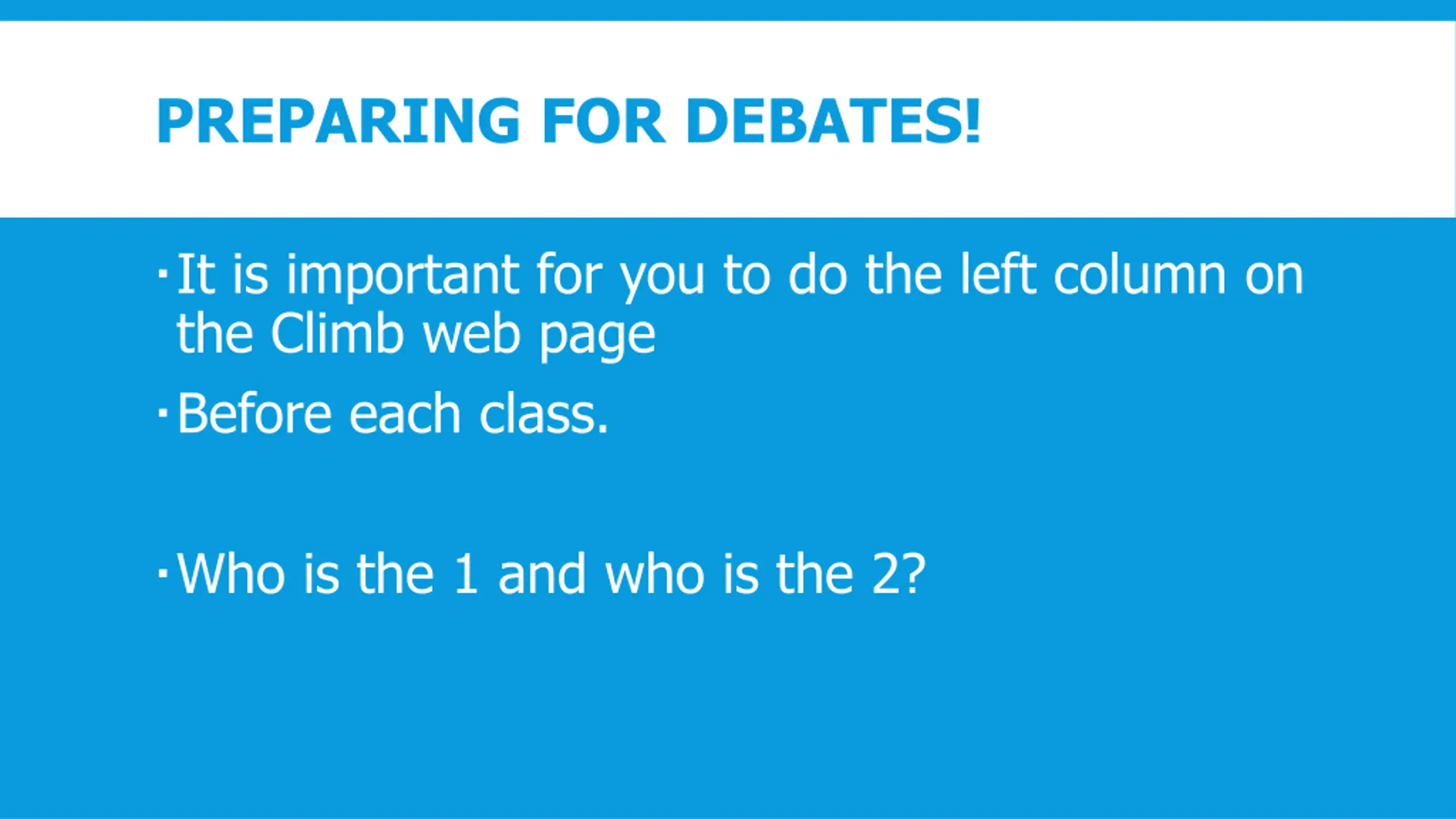 PREPARING FOR DEBATES! It is important for you to do the left column on the Climb web page Before each class. Who is the 1 and who is the 2?
