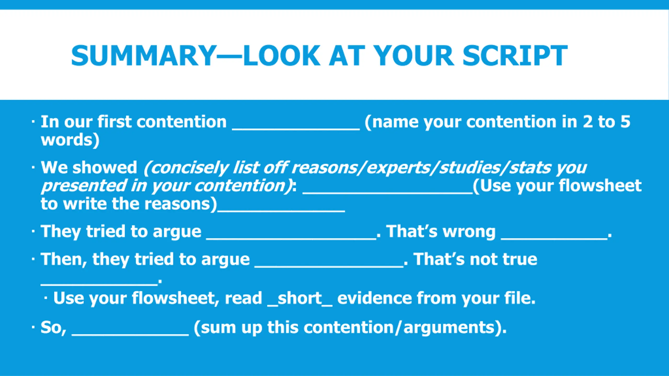 SUMMARYLOOK AT YOUR SCRIPT In our first contention ____________ (name your contention in 2 to 5 words) We showed (concisely list off reasons/experts/studies/stats you presented in your contention): ________________(Use your flowsheet to write the reasons)____________ They tried to argue ________________. That s wrong __________. Then, they tried to argue ______________. That s not true ___________. Use your flowsheet, read _short_ evidence from your file. So, ___________ (sum up this contention/arguments).
