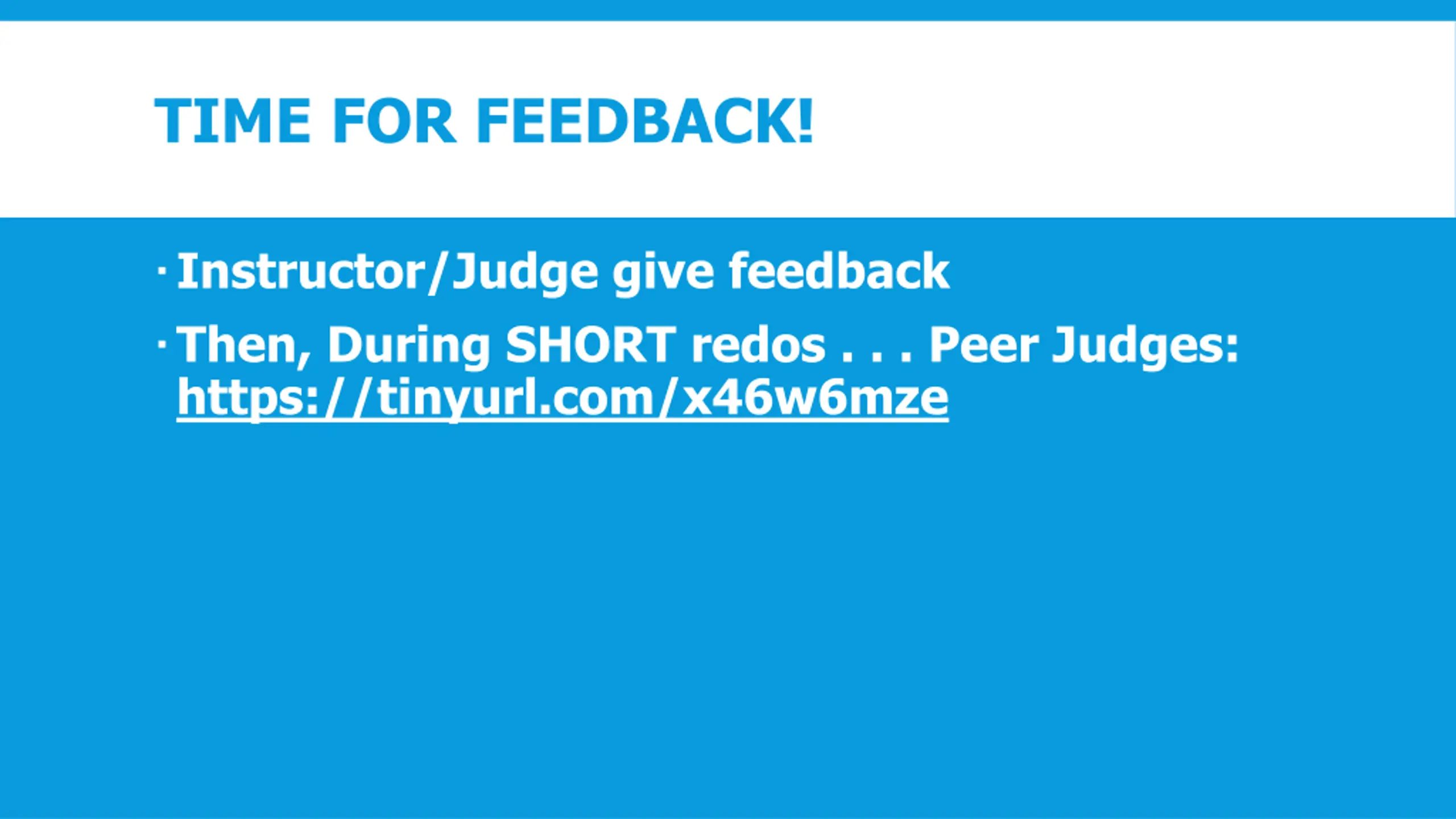 TIME FOR FEEDBACK! Instructor/Judge give feedback Then, During SHORT redos . . . Peer Judges: https://tinyurl.com/x46w6mze