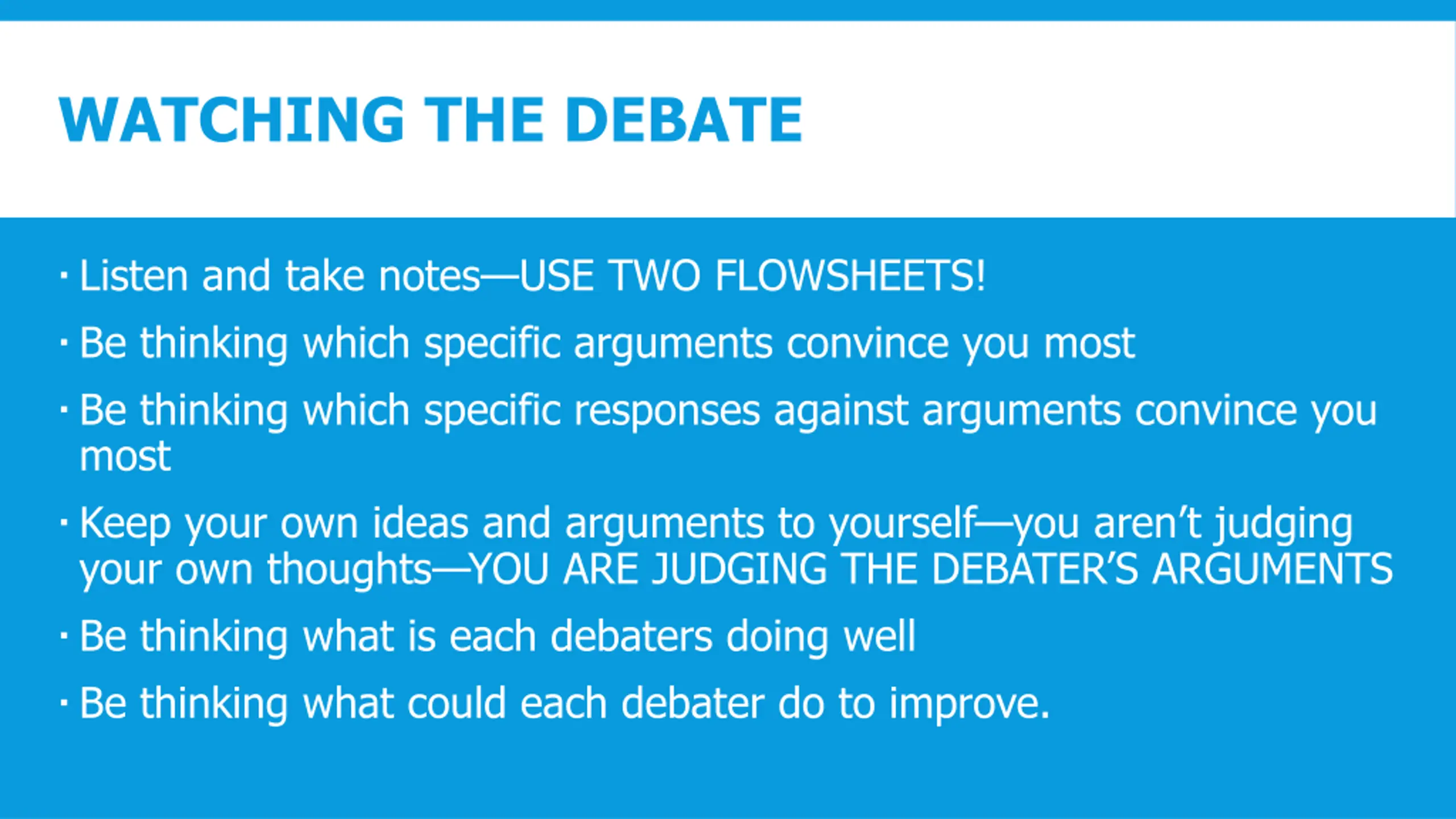 WATCHING THE DEBATE Listen and take notes USE TWO FLOWSHEETS! Be thinking which specific arguments convince you most Be thinking which specific responses against arguments convince you most Keep your own ideas and arguments to yourself you aren t judging your own thoughts YOU ARE JUDGING THE DEBATER S ARGUMENTS Be thinking what is each debaters doing well Be thinking what could each debater do to improve.