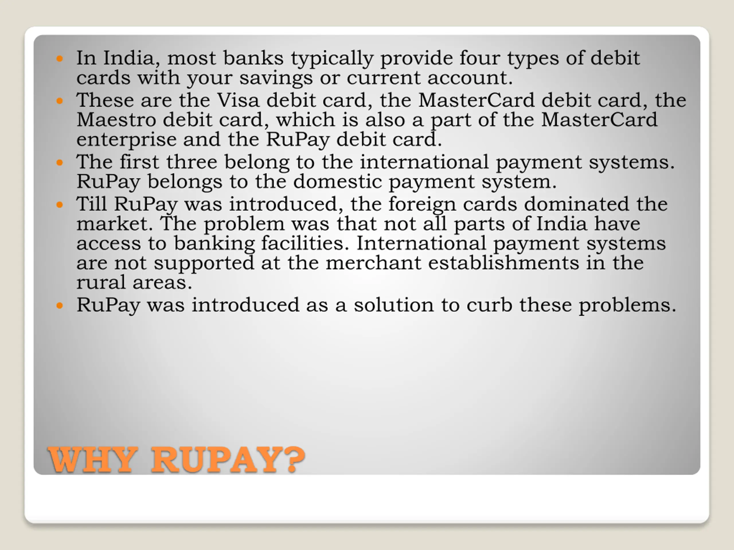In India, most banks typically provide four types of debit cards with your savings or current account. These are the Visa debit card, the MasterCard debit card, the Maestro debit card, which is also a part of the MasterCard enterprise and the RuPay debit card. The first three belong to the international payment systems. RuPay belongs to the domestic payment system. Till RuPay was introduced, the foreign cards dominated the market. The problem was that not all parts of India have access to banking facilities. International payment systems are not supported at the merchant establishments in the rural areas. RuPay was introduced as a solution to curb these problems. WHY RUPAY?