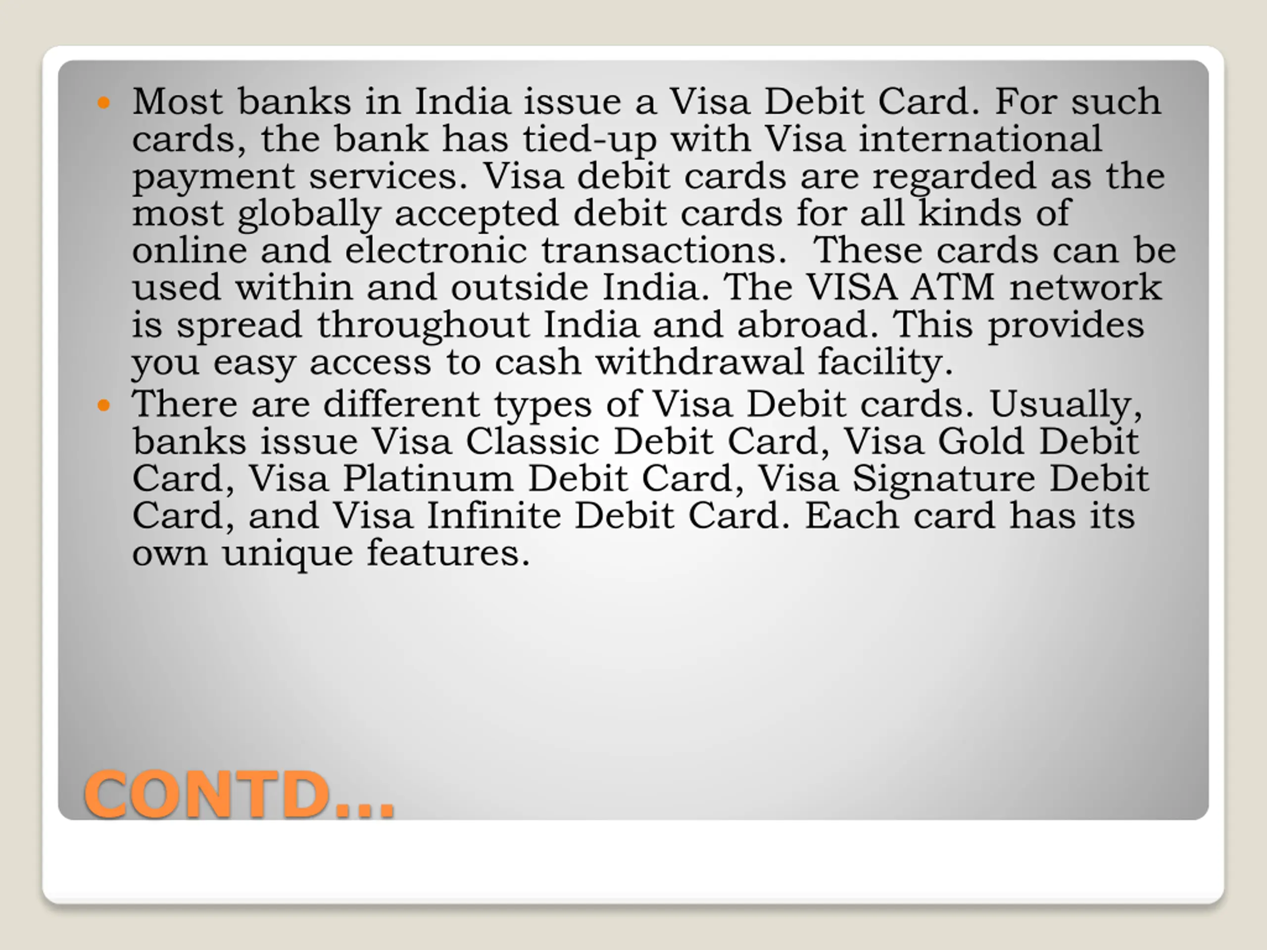 Most banks in India issue a Visa Debit Card. For such cards, the bank has tied-up with Visa international payment services. Visa debit cards are regarded as the most globally accepted debit cards for all kinds of online and electronic transactions. These cards can be used within and outside India. The VISA ATM network is spread throughout India and abroad. This provides you easy access to cash withdrawal facility. There are different types of Visa Debit cards. Usually, banks issue Visa Classic Debit Card, Visa Gold Debit Card, Visa Platinum Debit Card, Visa Signature Debit Card, and Visa Infinite Debit Card. Each card has its own unique features. CONTD