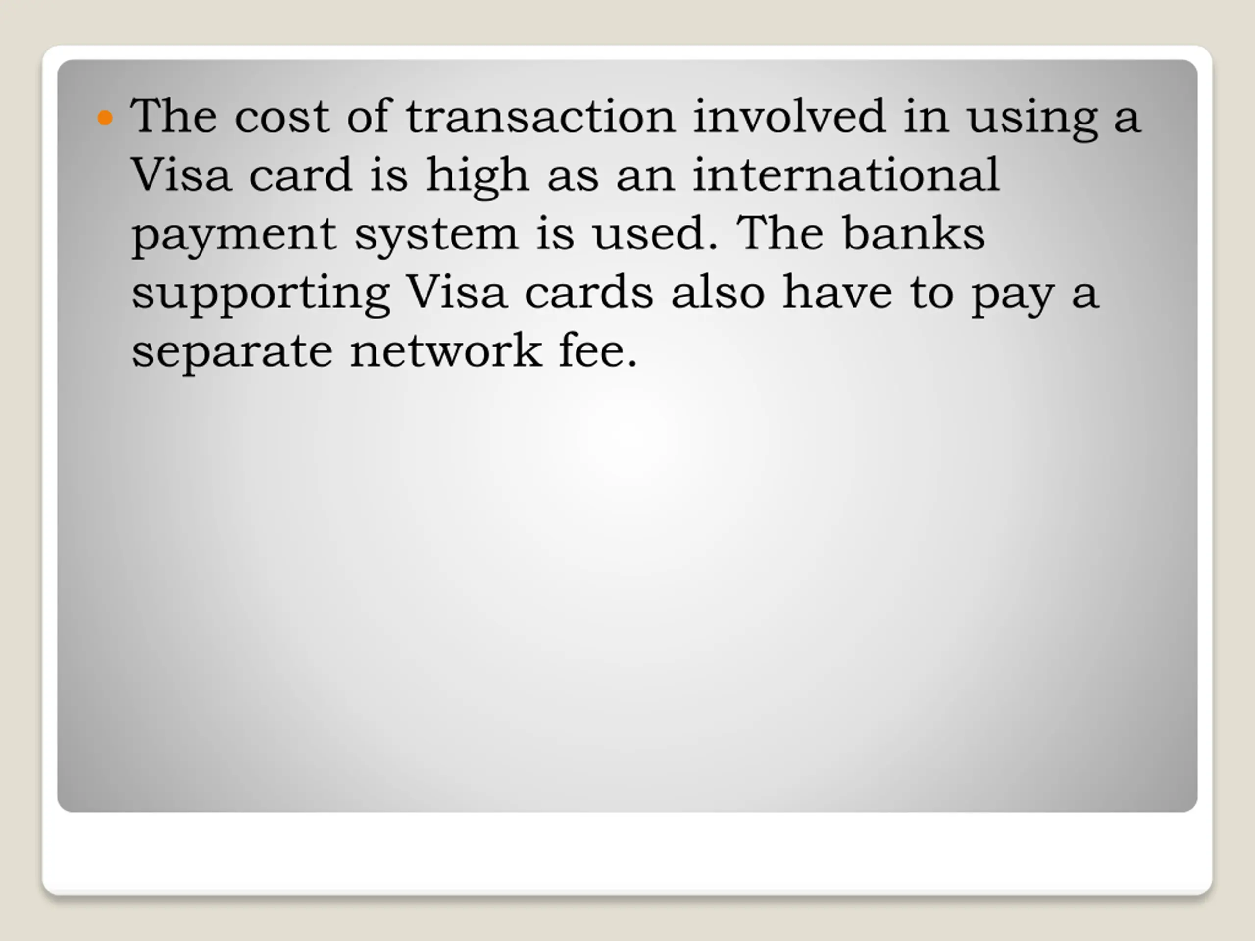 The cost of transaction involved in using a Visa card is high as an international payment system is used. The banks supporting Visa cards also have to pay a separate network fee.