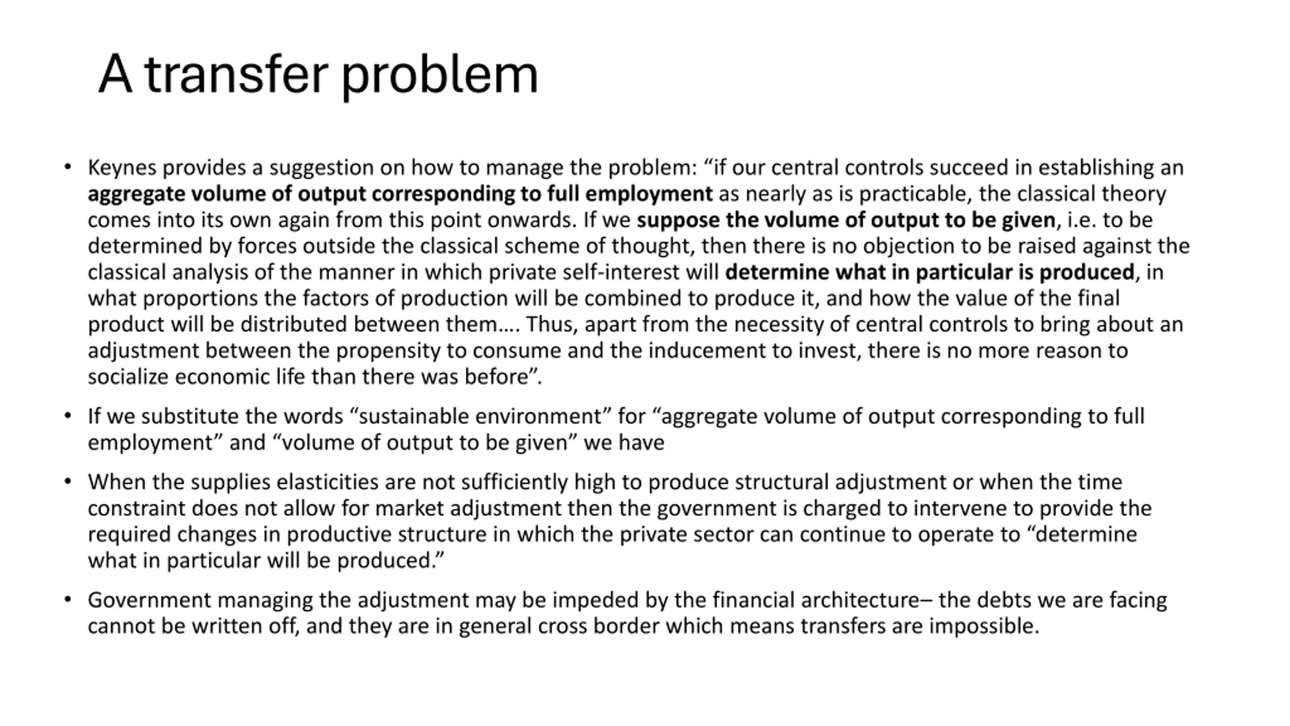 A transfer problem Keynes provides a suggestion on how to manage the problem: if our central controls succeed in establishing an aggregate volume of output corresponding to full employment as nearly as is practicable, the classical theory comes into its own again from this point onwards. If we suppose the volume of output to be given, i.e. to be determined by forces outside the classical scheme of thought, then there is no objection to be raised against the classical analysis of the manner in which private self-interest will determine what in particular is produced, in what proportions the factors of production will be combined to produce it, and how the value of the final product will be distributed between them . Thus, apart from the necessity of central controls to bring about an adjustment between the propensity to consume and the inducement to invest, there is no more reason to socialize economic life than there was before . If we substitute the words sustainable environment for aggregate volume of output corresponding to full employment and volume of output to be given we have When the supplies elasticities are not sufficiently high to produce structural adjustment or when the time constraint does not allow for market adjustment then the government is charged to intervene to provide the required changes in productive structure in which the private sector can continue to operate to determine what in particular will be produced. Government managing the adjustment may be impeded by the financial architecture the debts we are facing cannot be written off, and they are in general cross border which means transfers are impossible.