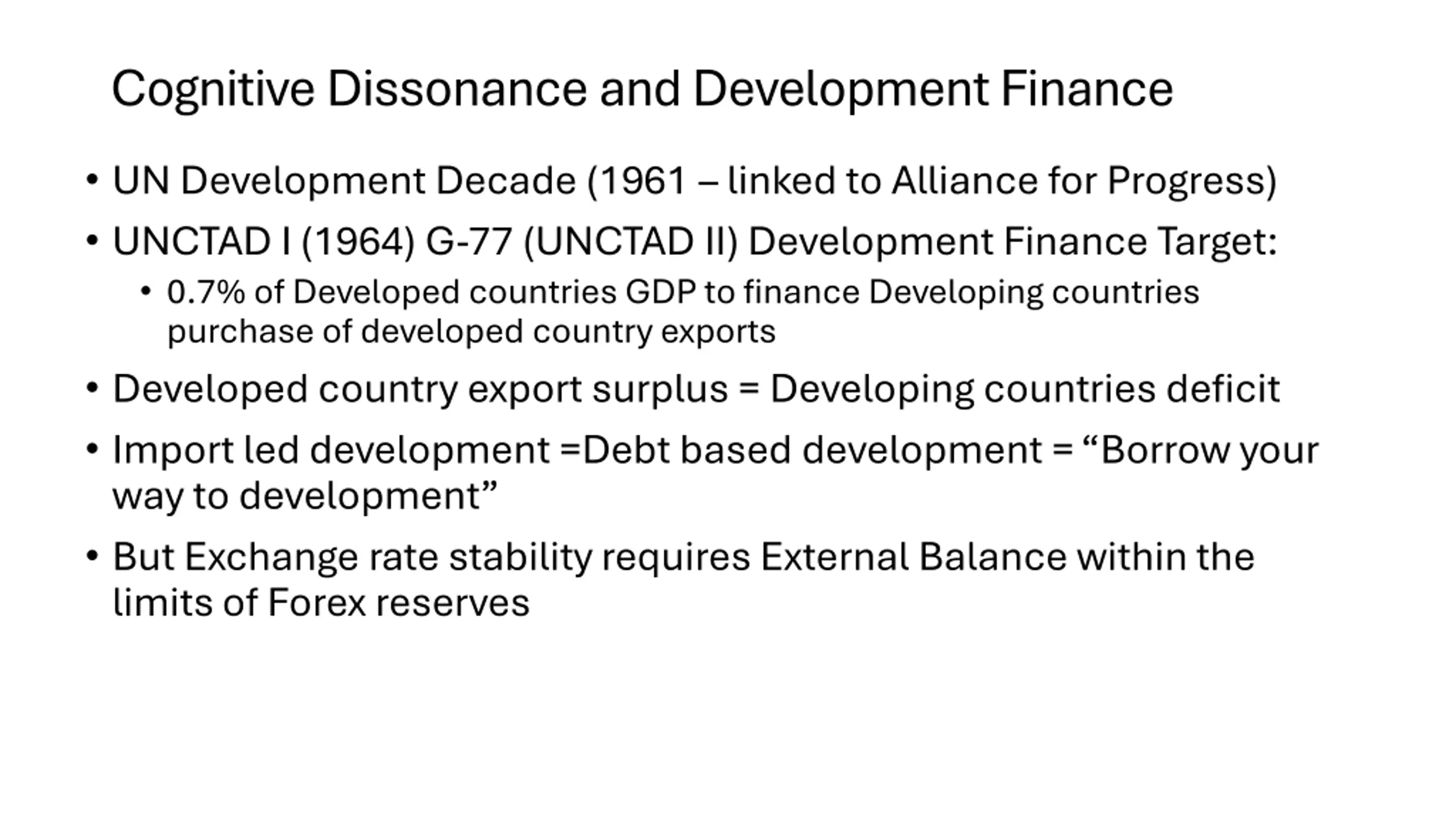 Cognitive Dissonance and Development Finance UN Development Decade (1961 linked to Alliance for Progress) UNCTAD I (1964) G-77 (UNCTAD II) Development Finance Target: 0.7% of Developed countries GDP to finance Developing countries purchase of developed country exports Developed country export surplus = Developing countries deficit Import led development =Debt based development = Borrow your way to development But Exchange rate stability requires External Balance within the limits of Forex reserves