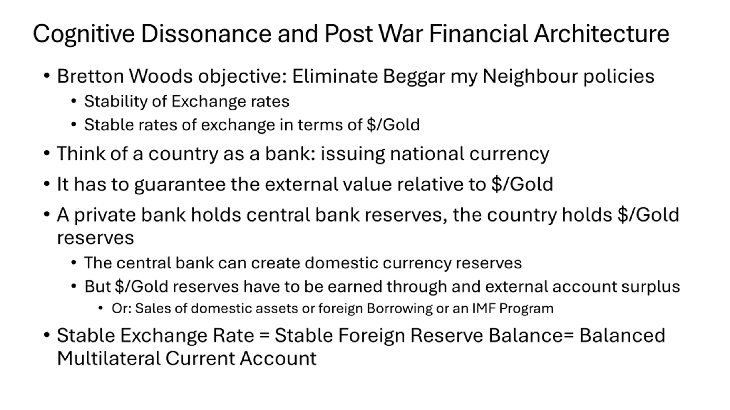 Cognitive Dissonance and Post War Financial Architecture Bretton Woods objective: Eliminate Beggar my Neighbour policies Stability of Exchange rates Stable rates of exchange in terms of $/Gold Think of a country as a bank: issuing national currency It has to guarantee the external value relative to $/Gold A private bank holds central bank reserves, the country holds $/Gold reserves The central bank can create domestic currency reserves But $/Gold reserves have to be earned through and external account surplus Or: Sales of domestic assets or foreign Borrowing or an IMF Program Stable Exchange Rate = Stable Foreign Reserve Balance= Balanced Multilateral Current Account