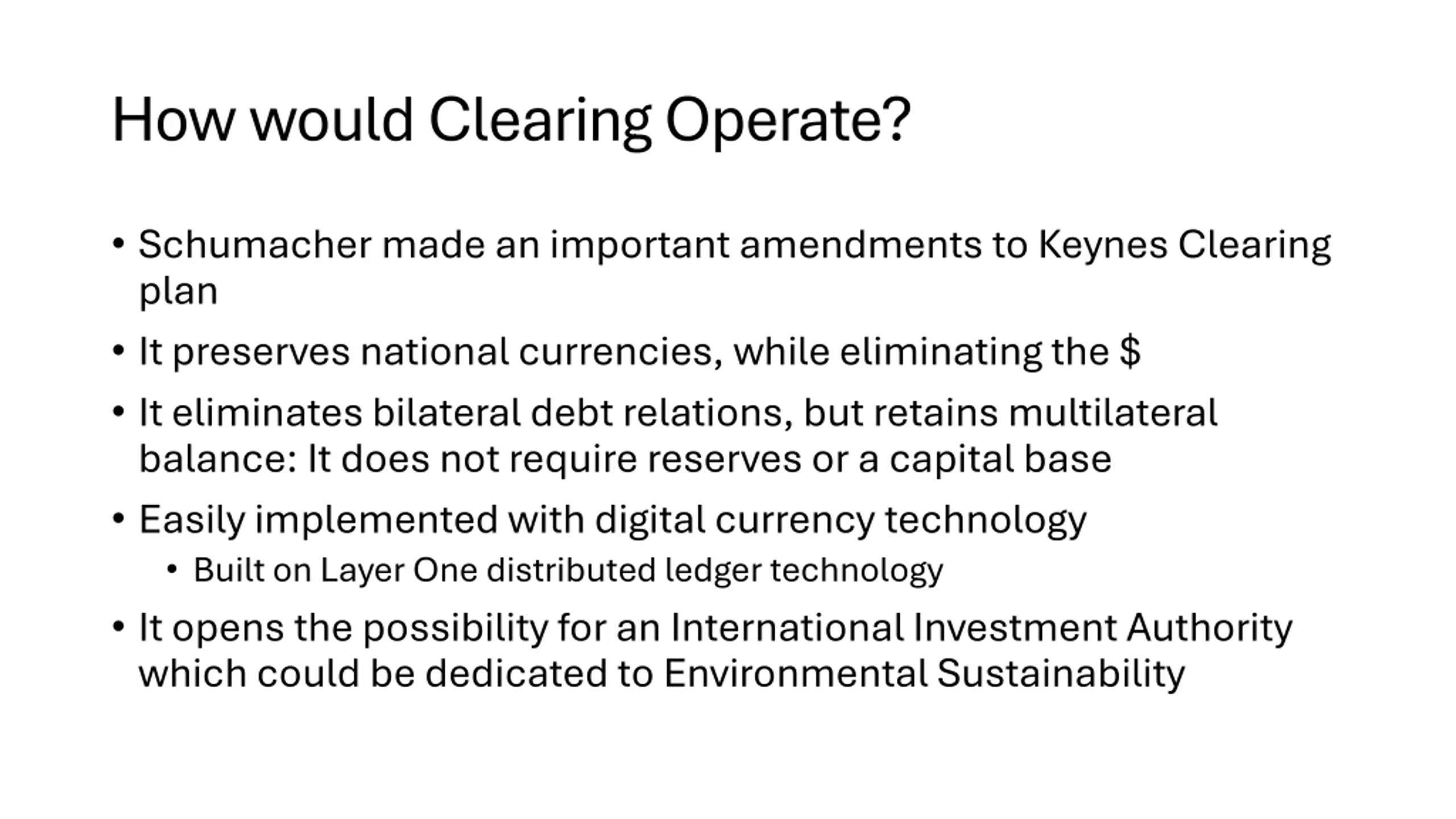 How would Clearing Operate? Schumacher made an important amendments to Keynes Clearing plan It preserves national currencies, while eliminating the $ It eliminates bilateral debt relations, but retains multilateral balance: It does not require reserves or a capital base Easily implemented with digital currency technology Built on Layer One distributed ledger technology It opens the possibility for an International Investment Authority which could be dedicated to Environmental Sustainability