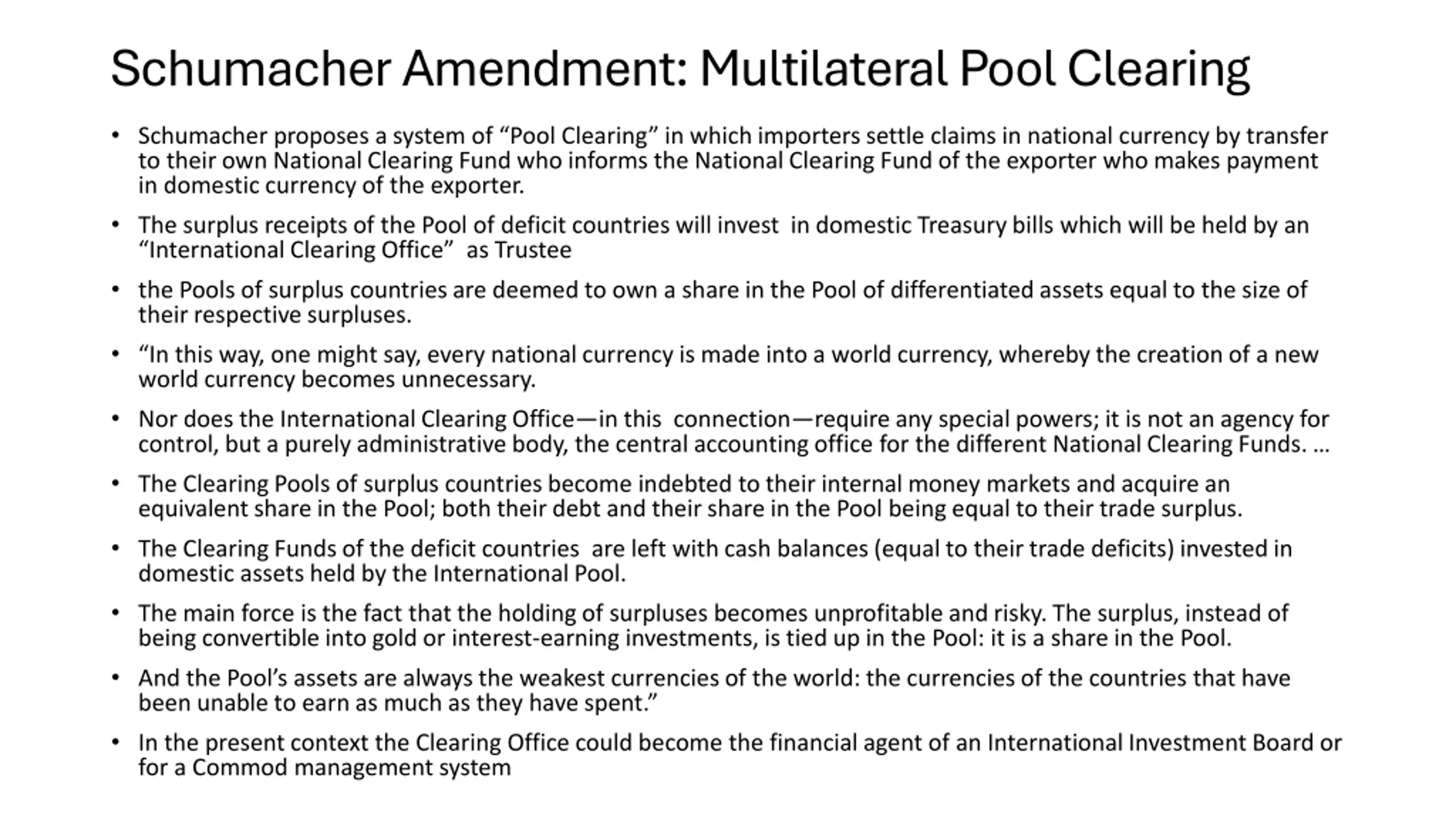 Schumacher Amendment: Multilateral Pool Clearing Schumacher proposes a system of Pool Clearing in which importers settle claims in national currency by transfer to their own National Clearing Fund who informs the National Clearing Fund of the exporter who makes payment in domestic currency of the exporter. The surplus receipts of the Pool of deficit countries will invest in domestic Treasury bills which will be held by an International Clearing Office as Trustee the Pools of surplus countries are deemed to own a share in the Pool of differentiated assets equal to the size of their respective surpluses. In this way, one might say, every national currency is made into a world currency, whereby the creation of a new world currency becomes unnecessary. Nor does the International Clearing Office in this connection require any special powers; it is not an agency for control, but a purely administrative body, the central accounting office for the different National Clearing Funds. The Clearing Pools of surplus countries become indebted to their internal money markets and acquire an equivalent share in the Pool; both their debt and their share in the Pool being equal to their trade surplus. The Clearing Funds of the deficit countries are left with cash balances (equal to their trade deficits) invested in domestic assets held by the International Pool. The main force is the fact that the holding of surpluses becomes unprofitable and risky. The surplus, instead of being convertible into gold or interest-earning investments, is tied up in the Pool: it is a share in the Pool. And the Pool s assets are always the weakest currencies of the world: the currencies of the countries that have been unable to earn as much as they have spent. In the present context the Clearing Office could become the financial agent of an International Investment Board or for a Commod management system