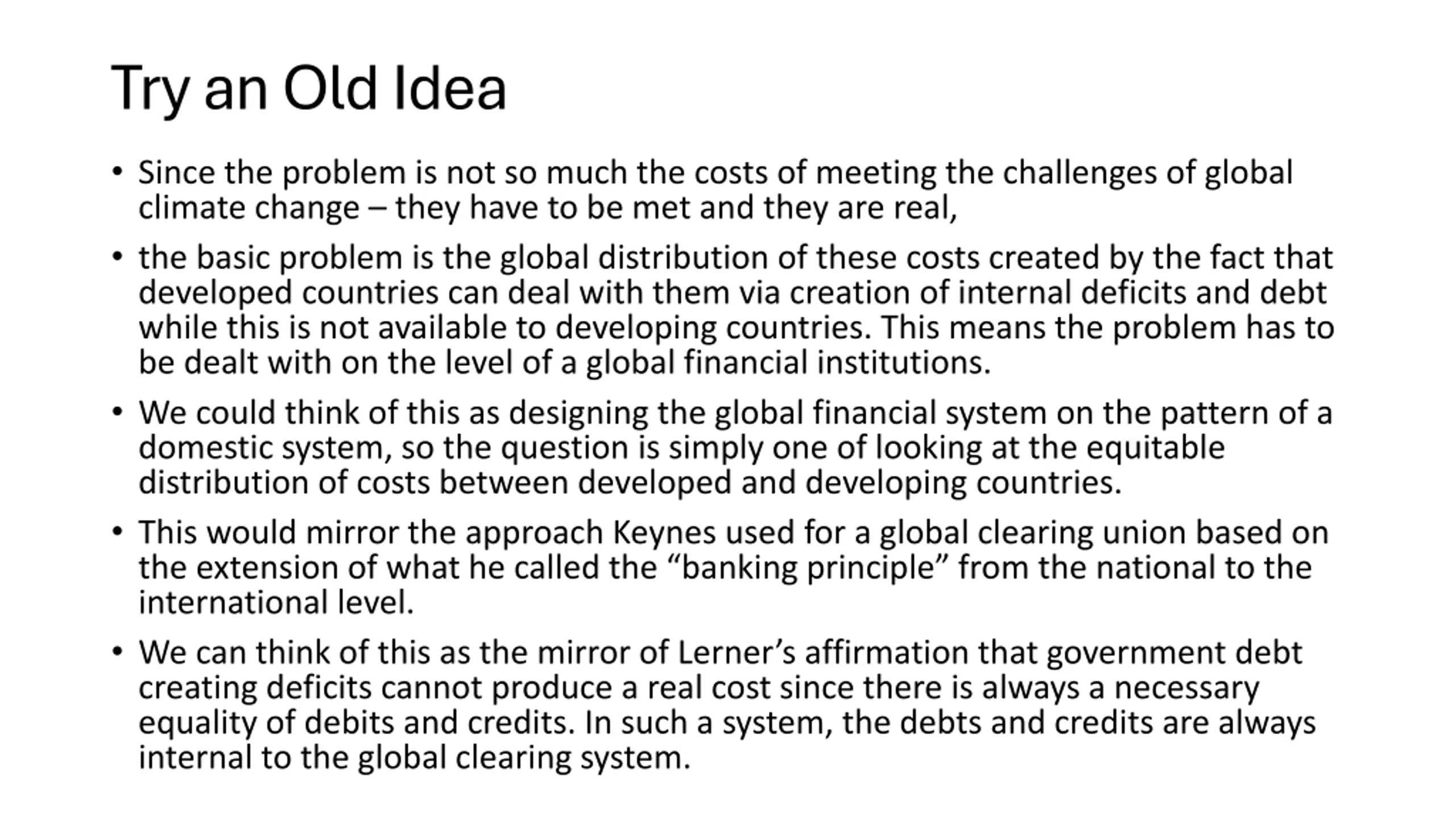 Try an Old Idea Since the problem is not so much the costs of meeting the challenges of global climate change they have to be met and they are real, the basic problem is the global distribution of these costs created by the fact that developed countries can deal with them via creation of internal deficits and debt while this is not available to developing countries. This means the problem has to be dealt with on the level of a global financial institutions. We could think of this as designing the global financial system on the pattern of a domestic system, so the question is simply one of looking at the equitable distribution of costs between developed and developing countries. This would mirror the approach Keynes used for a global clearing union based on the extension of what he called the banking principle from the national to the international level. We can think of this as the mirror of Lerner s affirmation that government debt creating deficits cannot produce a real cost since there is always a necessary equality of debits and credits. In such a system, the debts and credits are always internal to the global clearing system.