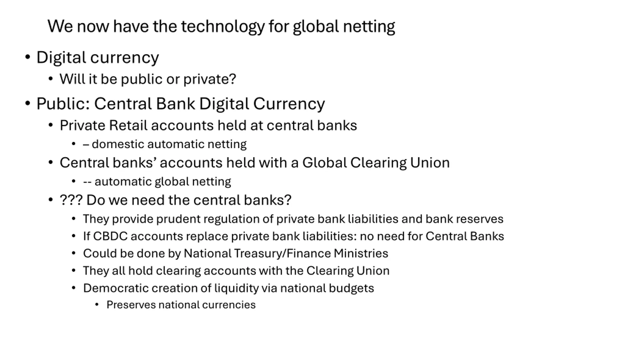 We now have the technology for global netting Digital currency Will it be public or private? Public: Central Bank Digital Currency Private Retail accounts held at central banks domestic automatic netting Central banks accounts held with a Global Clearing Union --automatic global netting ??? Do we need the central banks? They provide prudent regulation of private bank liabilities and bank reserves If CBDC accounts replace private bank liabilities: no need for Central Banks Could be done by National Treasury/Finance Ministries They all hold clearing accounts with the Clearing Union Democratic creation of liquidity via national budgets Preserves national currencies