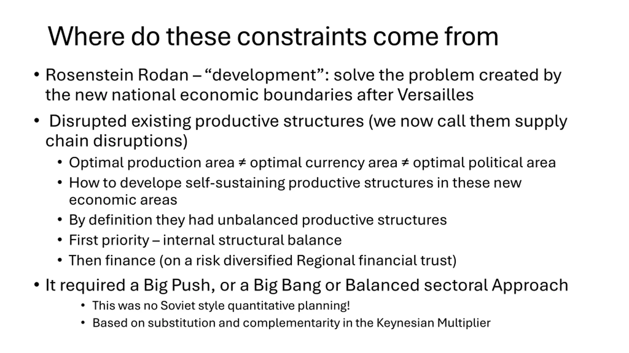 Where do these constraints come from Rosenstein Rodan development : solve the problem created by the new national economic boundaries after Versailles Disrupted existing productive structures (we now call them supply chain disruptions) Optimal production area optimal currency area optimal political area How to develope self-sustaining productive structures in these new economic areas By definition they had unbalanced productive structures First priority internal structural balance Then finance (on a risk diversified Regional financial trust) It required a Big Push, or a Big Bang or Balanced sectoral Approach This was no Soviet style quantitative planning! Based on substitution and complementarity in the Keynesian Multiplier