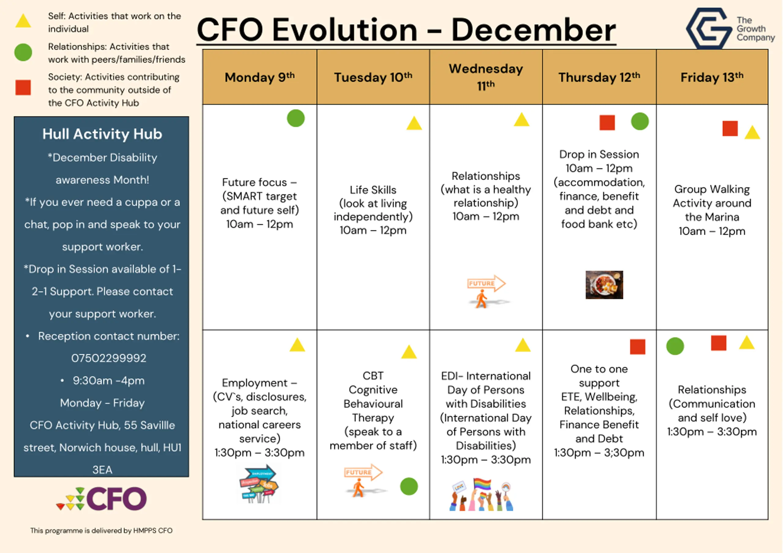 CFO Evolution - December Self: Activities that work on the individual Relationships: Activities that work with peers/families/friends Wednesday 18th Monday 16th Tuesday 17th Thursday 19th Friday 20th Society: Activities contributing to the community outside of the CFO Activity Hub Hull Activity Hub Cooking on a budget (level 1 / level 2 food hygiene course) 10am 12pm *December Disability awareness Month! Arts and Crafts Diamond Art 10am 12pm Future focus (SMART target and future self) 1:30pm 3:30pm Men s Mental Health Awareness session *If you ever need a cuppa or a chat, pop in and speak to your Christmas Celebrations support worker. *Drop in Session available of 1- Food Games Music Wellbeing Activities 2-1 Support. Please contact your support worker. Reception contact number: 07502299992 All day Drop in Session 10am 12pm (accommodation, finance, benefit and debt and food bank etc) Drop in Session 10am 12pm (accommodation, finance, benefit and debt and food bank etc) 9:30am -4pm Employment (CV`s, disclosures, job search, national careers service) 1:30pm 3:30pm Monday - Friday Arts and Crafts 1:30pm 3:30pm CFO Activity Hub, 55 Savillle street, Norwich house, hull, HU1 3EA This programme is delivered by HMPPS CFO