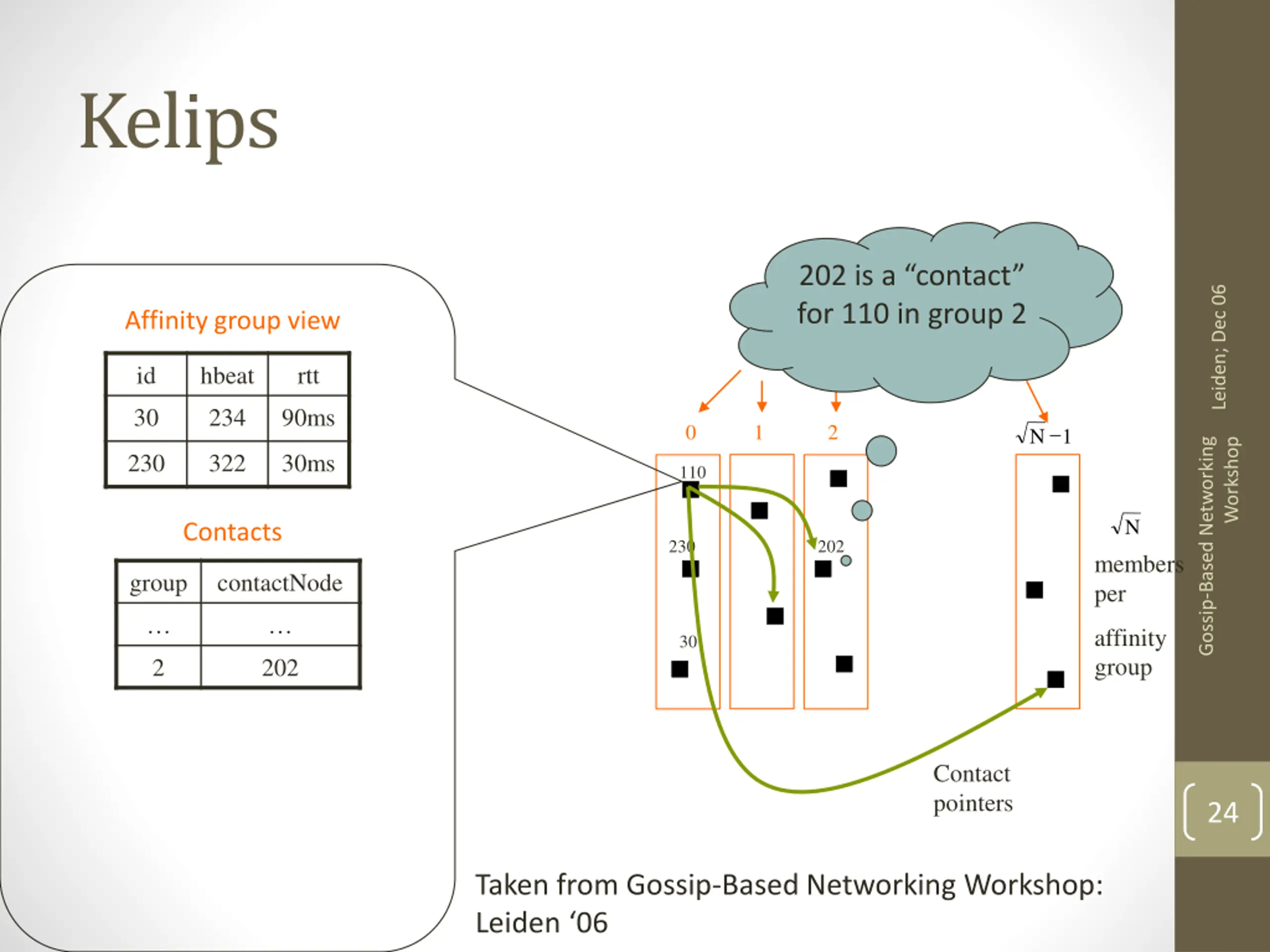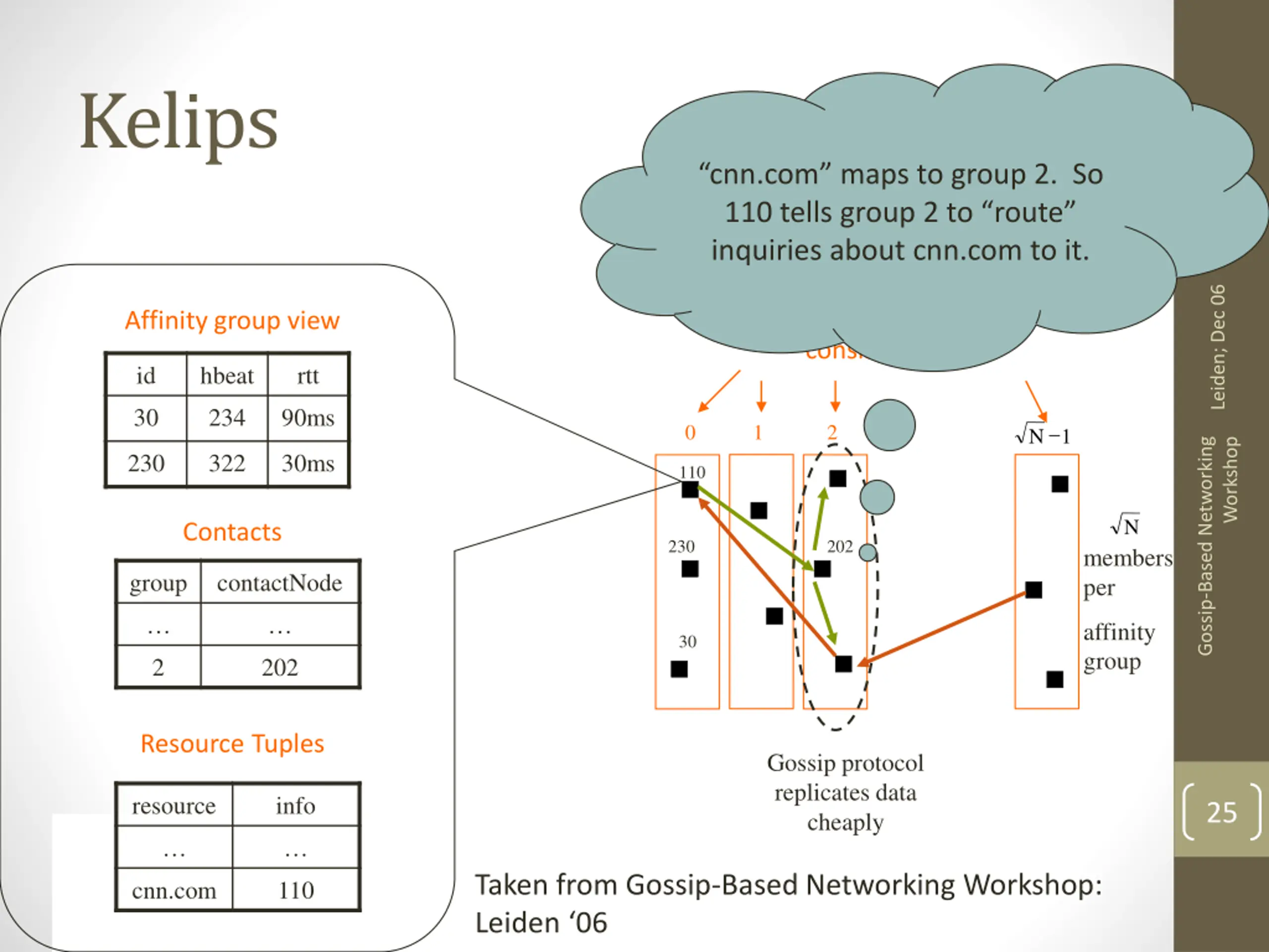 Kelips Affinity Groups: peer membership thru consistent hash Leiden; Dec 06 Map nodes to affinity groups N 0 1 2 1 Gossip-Based Networking Workshop 110 N members per affinity group 230 202 30 22 Taken from Gossip-Based Networking Workshop: Leiden 06