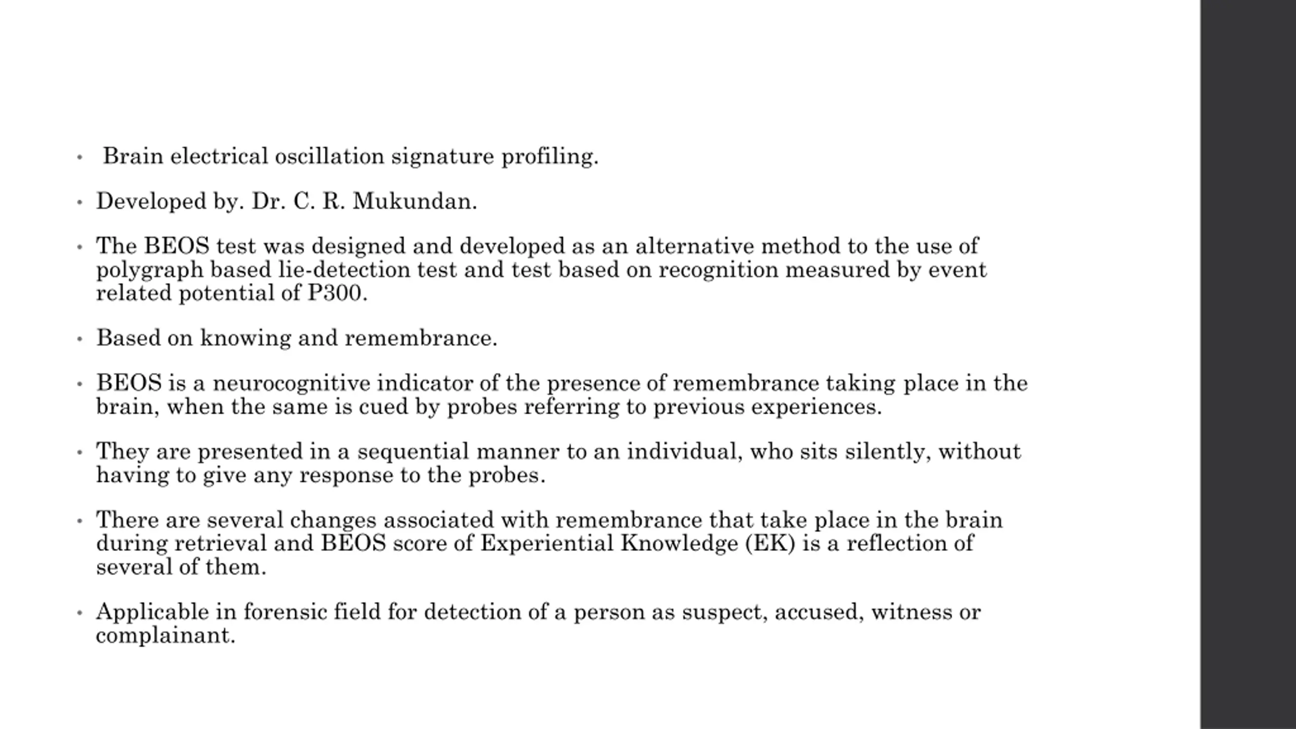 Brain electrical oscillation signature profiling. Developed by. Dr. C. R. Mukundan. The BEOS test was designed and developed as an alternative method to the use of polygraph based lie-detection test and test based on recognition measured by event related potential of P300. Based on knowing and remembrance. BEOS is a neurocognitive indicator of the presence of remembrance taking place in the brain, when the same is cued by probes referring to previous experiences. They are presented in a sequential manner to an individual, who sits silently, without having to give any response to the probes. There are several changes associated with remembrance that take place in the brain during retrieval and BEOS score of Experiential Knowledge (EK) is a reflection of several of them. Applicable in forensic field for detection of a person as suspect, accused, witness or complainant.