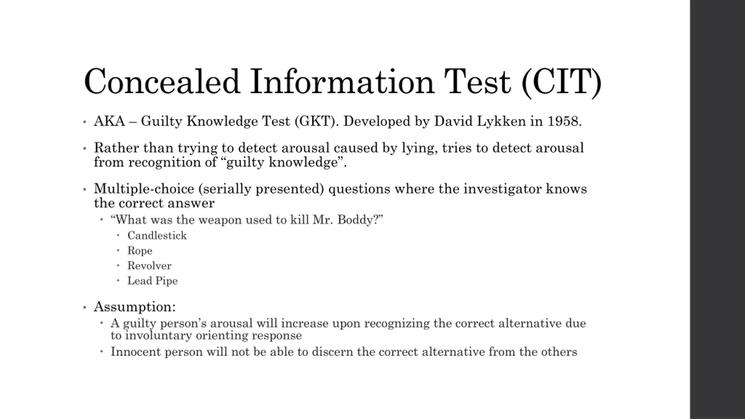 Concealed Information Test (CIT) AKA Guilty Knowledge Test (GKT). Developed by David Lykken in 1958. Rather than trying to detect arousal caused by lying, tries to detect arousal from recognition of guilty knowledge . Multiple-choice (serially presented) questions where the investigator knows the correct answer What was the weapon used to kill Mr. Boddy? Candlestick Rope Revolver Lead Pipe Assumption: A guilty person s arousal will increase upon recognizing the correct alternative due to involuntary orienting response Innocent person will not be able to discern the correct alternative from the others