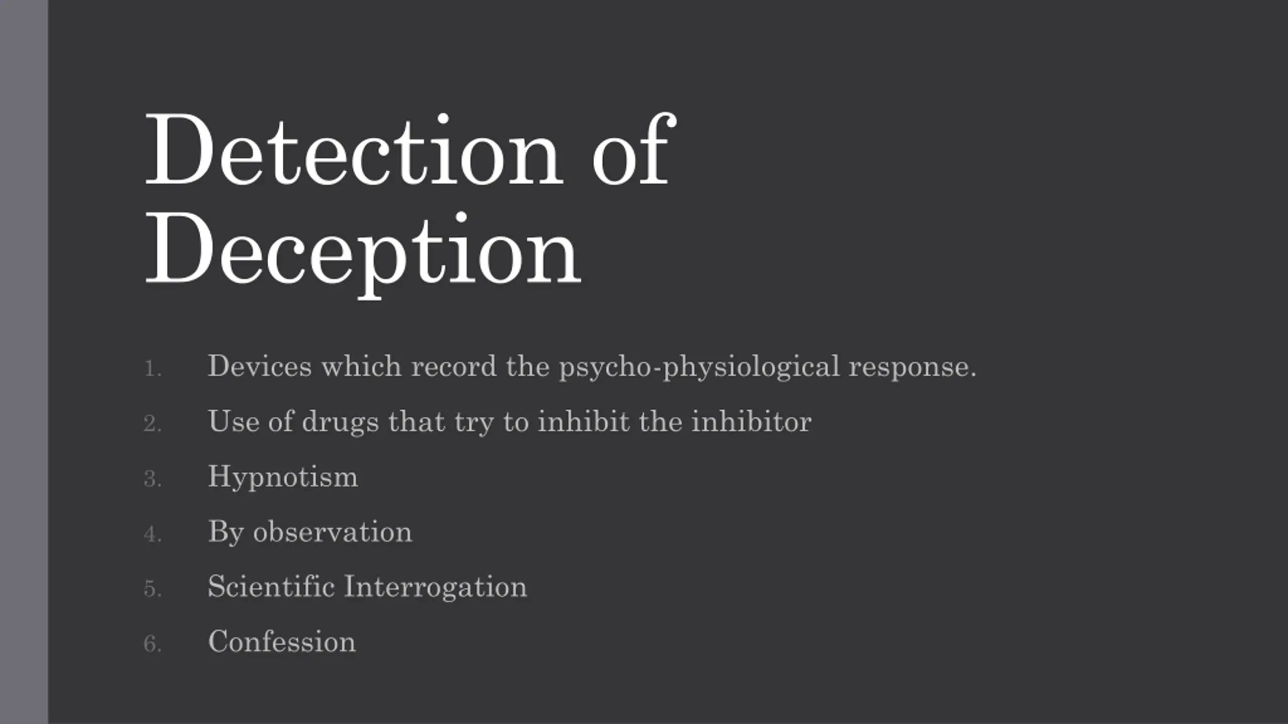 Detection of Deception Devices which record the psycho-physiological response. 1. Use of drugs that try to inhibit the inhibitor 2. Hypnotism 3. By observation 4. Scientific Interrogation 5. Confession 6.