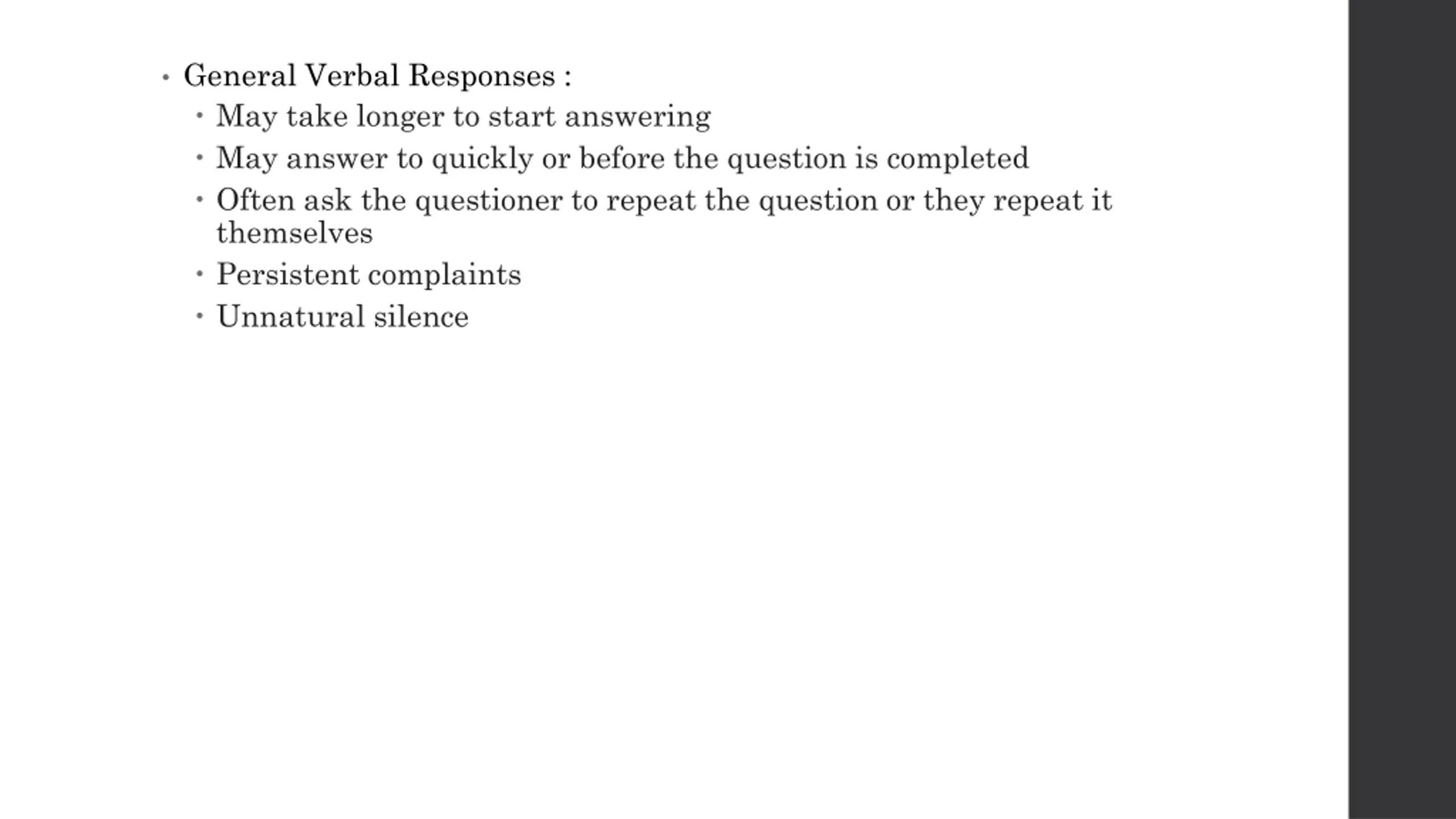 General Verbal Responses : May take longer to start answering May answer to quickly or before the question is completed Often ask the questioner to repeat the question or they repeat it themselves Persistent complaints Unnatural silence