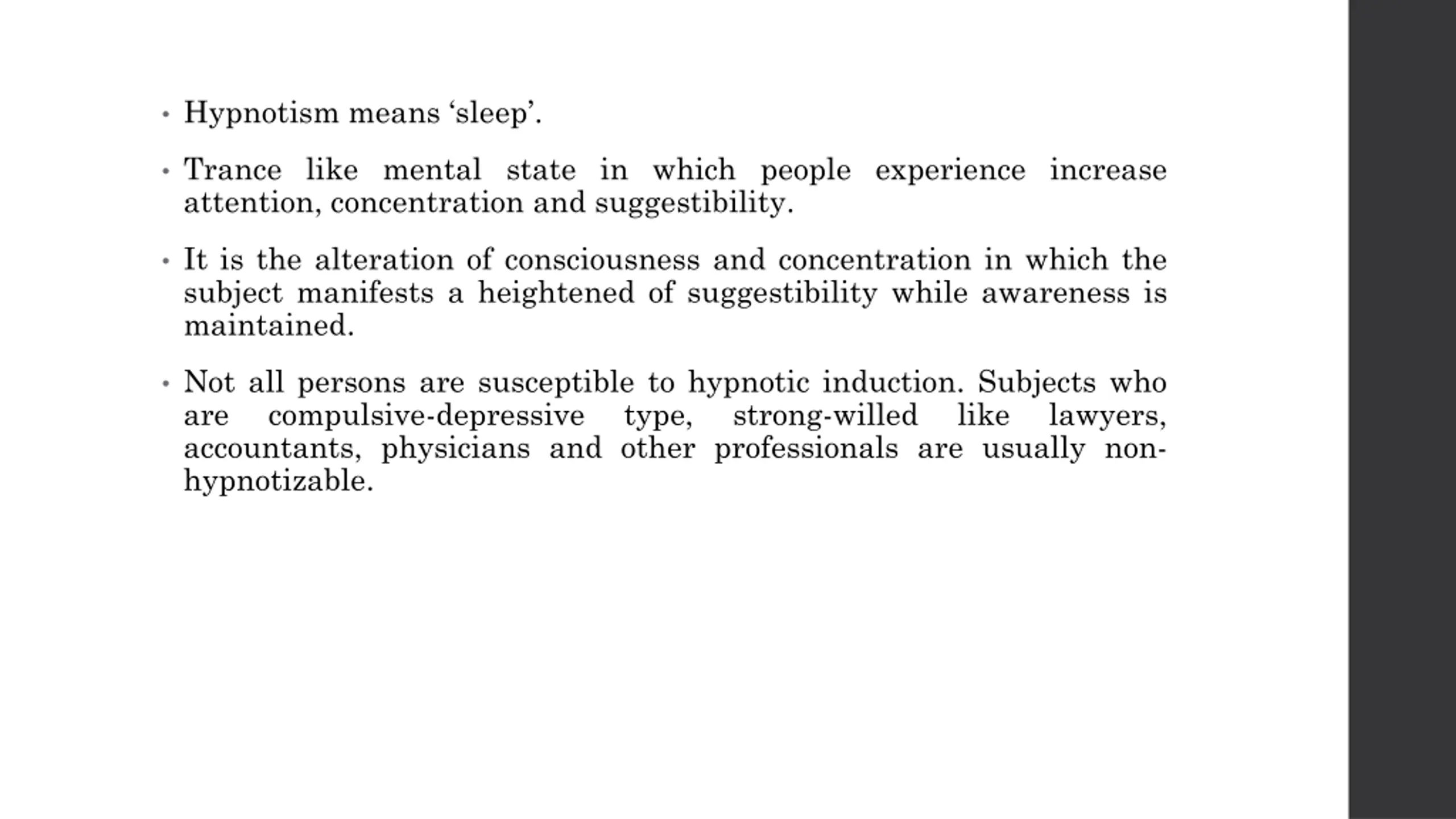 Hypnotism means sleep. Trance like mental state in which people experience increase attention, concentration and suggestibility. It is the alteration of consciousness and concentration in which the subject manifests a heightened of suggestibility while awareness is maintained. Not all persons are susceptible to hypnotic induction. Subjects who are compulsive-depressive type, accountants, physicians and other professionals are usually non- hypnotizable. strong-willed like lawyers,
