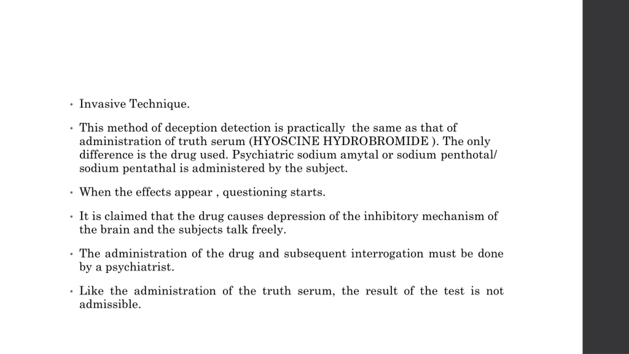 Invasive Technique. This method of deception detection is practically the same as that of administration of truth serum (HYOSCINE HYDROBROMIDE ). The only difference is the drug used. Psychiatric sodium amytal or sodium penthotal/ sodium pentathal is administered by the subject. When the effects appear , questioning starts. It is claimed that the drug causes depression of the inhibitory mechanism of the brain and the subjects talk freely. The administration of the drug and subsequent interrogation must be done by a psychiatrist. Like the administration of the truth serum, the result of the test is not admissible.
