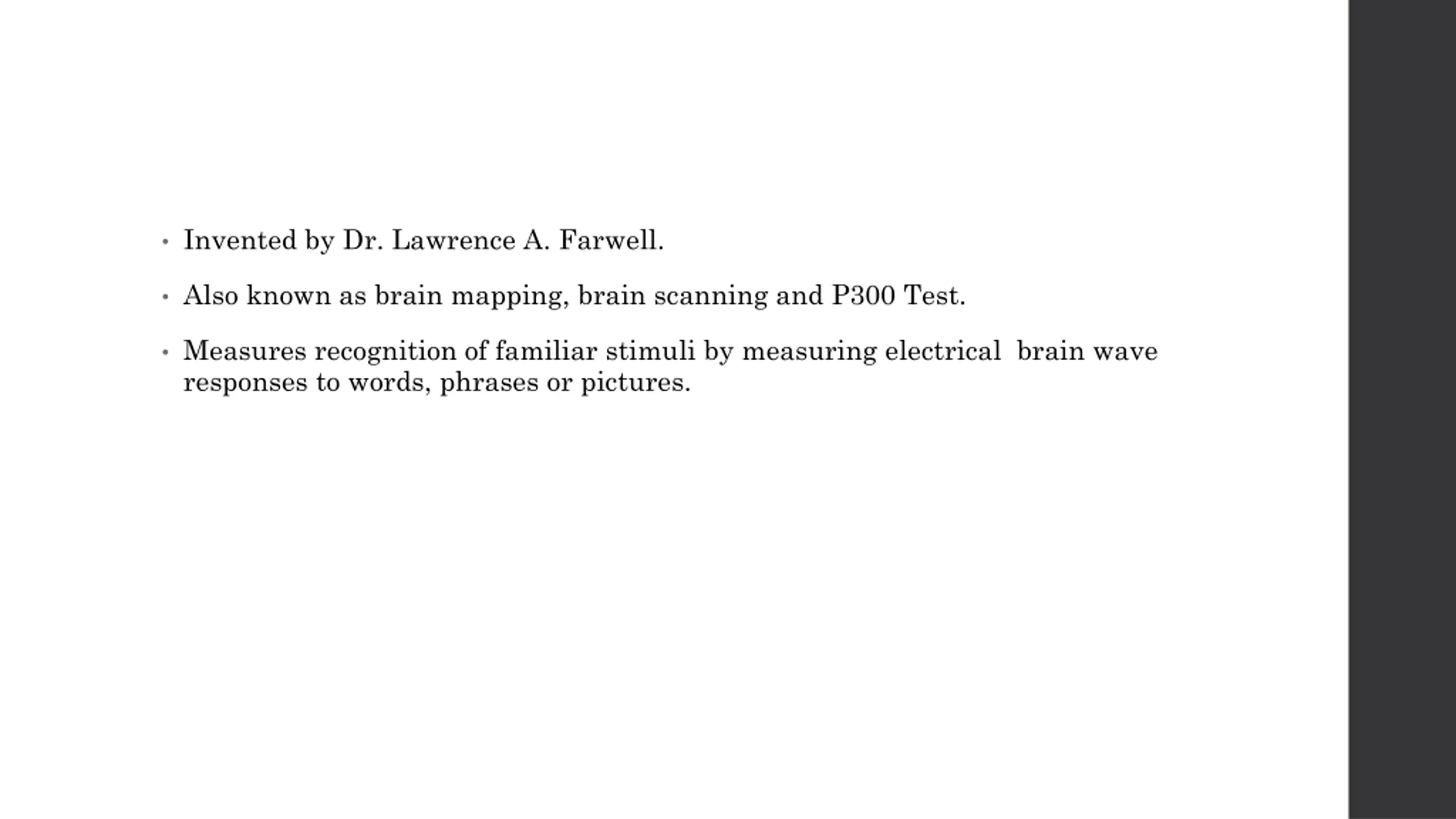 Invented by Dr. Lawrence A. Farwell. Also known as brain mapping, brain scanning and P300 Test. Measures recognition of familiar stimuli by measuring electrical brain wave responses to words, phrases or pictures.