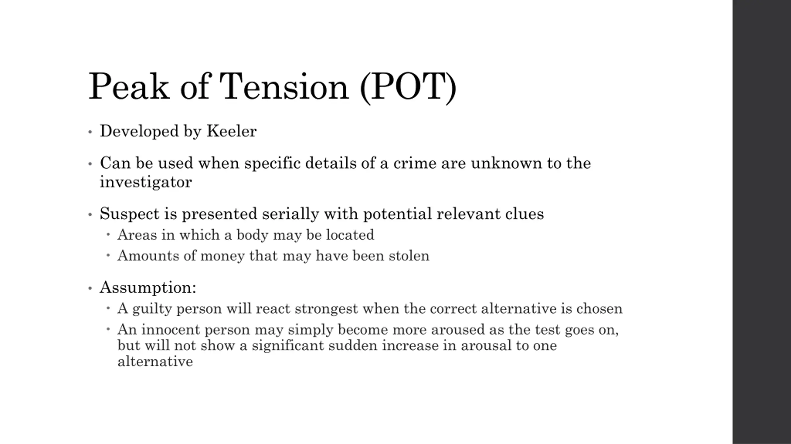 Peak of Tension (POT) Developed by Keeler Can be used when specific details of a crime are unknown to the investigator Suspect is presented serially with potential relevant clues Areas in which a body may be located Amounts of money that may have been stolen Assumption: A guilty person will react strongest when the correct alternative is chosen An innocent person may simply become more aroused as the test goes on, but will not show a significant sudden increase in arousal to one alternative
