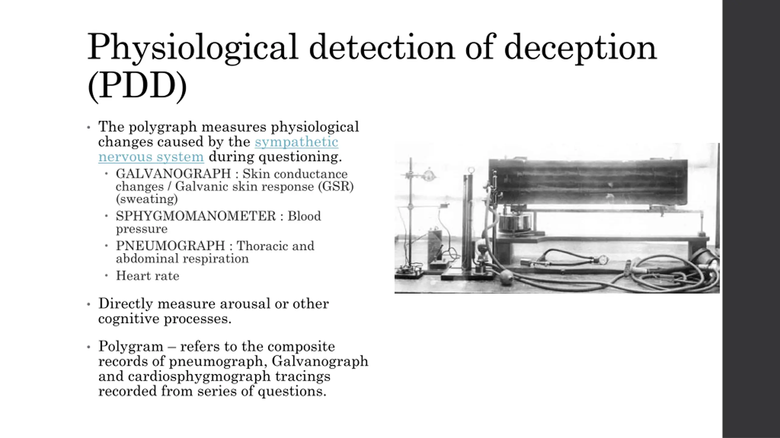 Physiological detection of deception (PDD) The polygraph measures physiological changes caused by the sympathetic nervous system during questioning. GALVANOGRAPH : Skin conductance changes / Galvanic skin response (GSR) (sweating) SPHYGMOMANOMETER : Blood pressure PNEUMOGRAPH : Thoracic and abdominal respiration Heart rate Directly measure arousal or other cognitive processes. Polygram refers to the composite records of pneumograph, Galvanograph and cardiosphygmograph tracings recorded from series of questions.