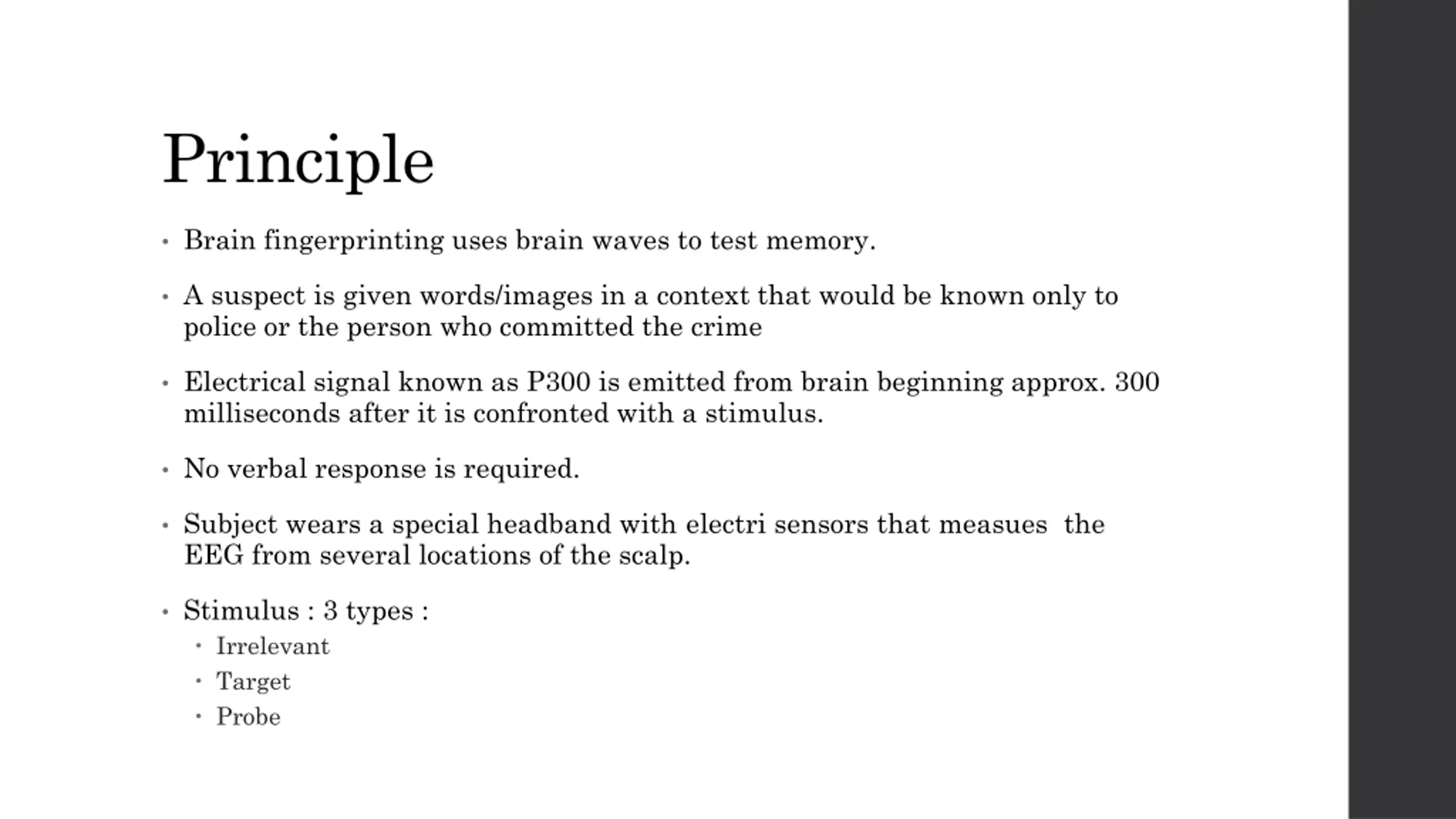 Principle Brain fingerprinting uses brain waves to test memory. A suspect is given words/images in a context that would be known only to police or the person who committed the crime Electrical signal known as P300 is emitted from brain beginning approx. 300 milliseconds after it is confronted with a stimulus. No verbal response is required. Subject wears a special headband with electri sensors that measues the EEG from several locations of the scalp. Stimulus : 3 types : Irrelevant Target Probe