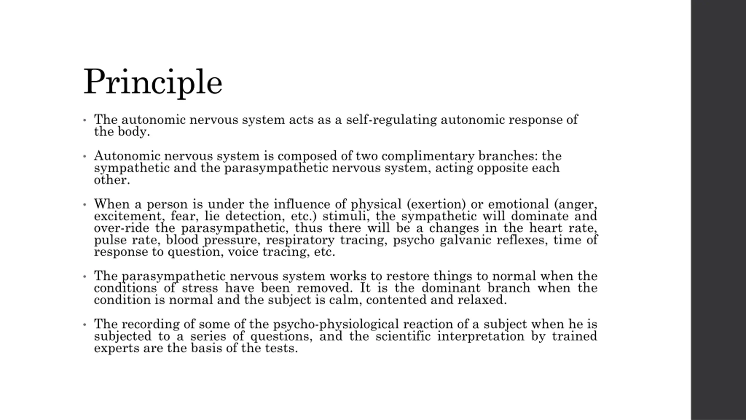 Principle The autonomic nervous system acts as a self-regulating autonomic response of the body. Autonomic nervous system is composed of two complimentary branches: the sympathetic and the parasympathetic nervous system, acting opposite each other. When a person is under the influence of physical (exertion) or emotional (anger, excitement, fear, lie detection, etc.) stimuli, the sympathetic will dominate and over-ride the parasympathetic, thus there will be a changes in the heart rate, pulse rate, blood pressure, respiratory tracing, psycho galvanic reflexes, time of response to question, voice tracing, etc. The parasympathetic nervous system works to restore things to normal when the conditions of stress have been removed. It is the dominant branch when the condition is normal and the subject is calm, contented and relaxed. The recording of some of the psycho-physiological reaction of a subject when he is subjected to a series of questions, and the scientific interpretation by trained experts are the basis of the tests.