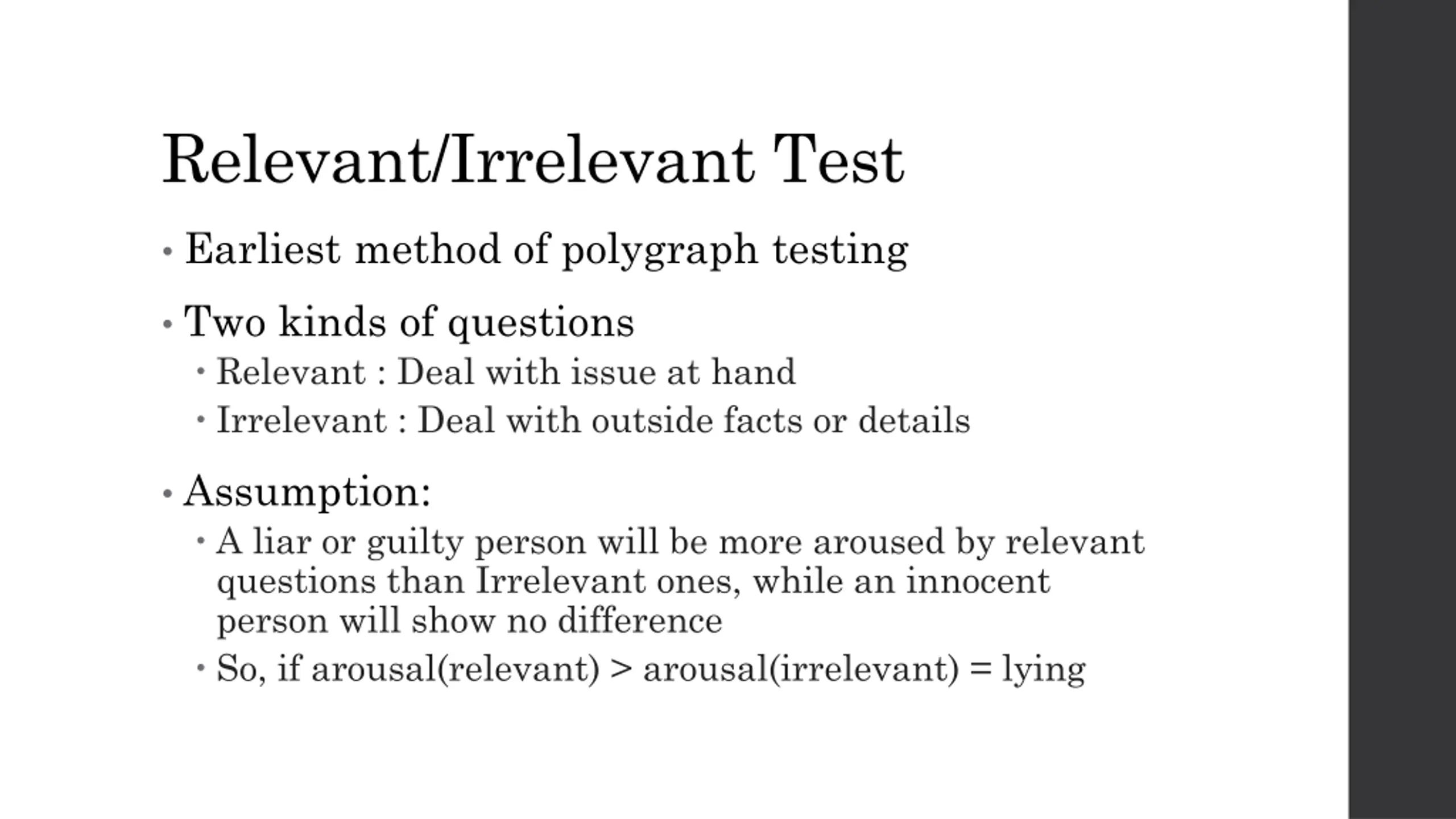 Relevant/Irrelevant Test Earliest method of polygraph testing Two kinds of questions Relevant : Deal with issue at hand Irrelevant : Deal with outside facts or details Assumption: A liar or guilty person will be more aroused by relevant questions than Irrelevant ones, while an innocent person will show no difference So, if arousal(relevant) > arousal(irrelevant) = lying