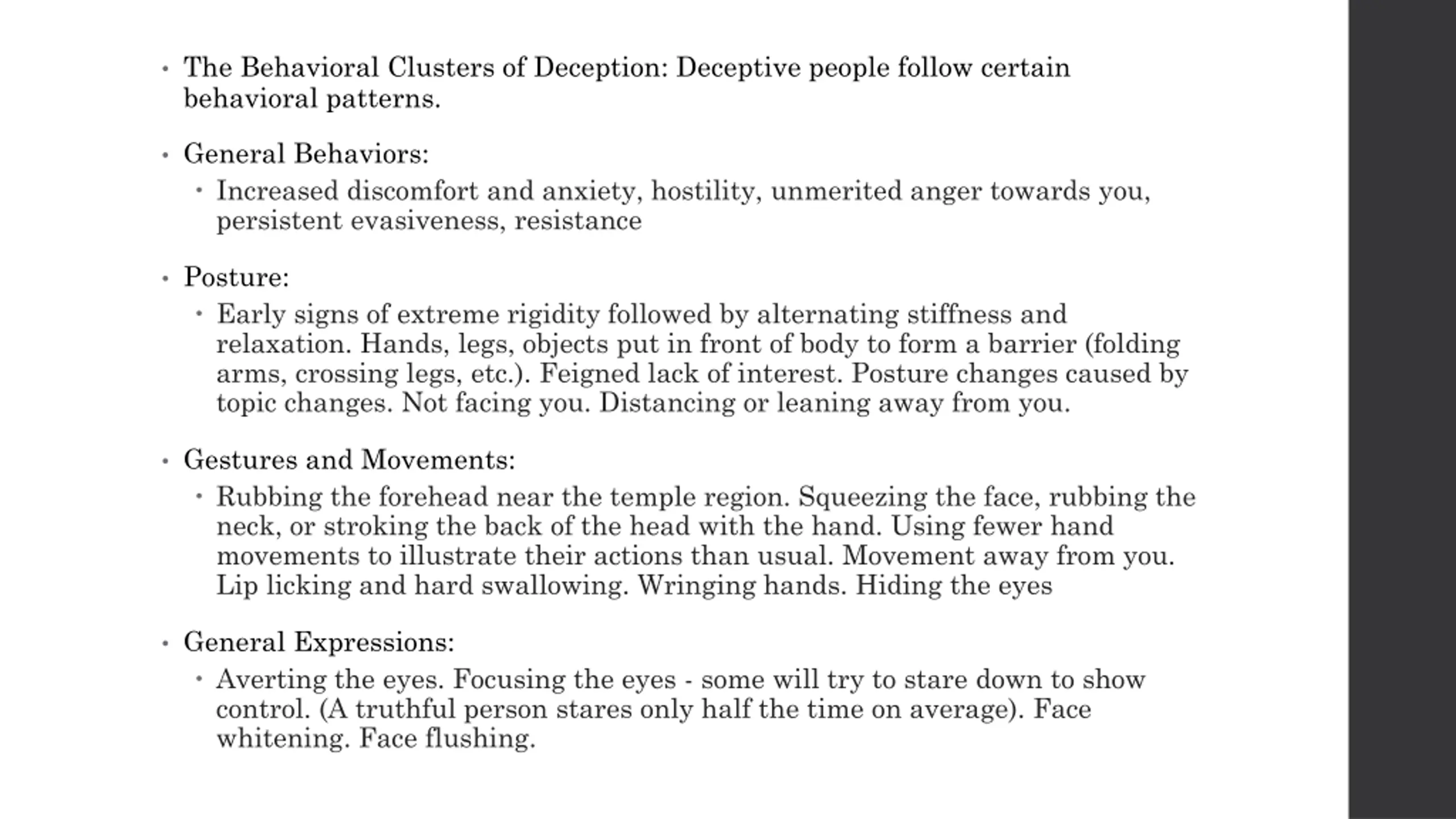 The Behavioral Clusters of Deception: Deceptive people follow certain behavioral patterns. General Behaviors: Increased discomfort and anxiety, hostility, unmerited anger towards you, persistent evasiveness, resistance Posture: Early signs of extreme rigidity followed by alternating stiffness and relaxation. Hands, legs, objects put in front of body to form a barrier (folding arms, crossing legs, etc.). Feigned lack of interest. Posture changes caused by topic changes. Not facing you. Distancing or leaning away from you. Gestures and Movements: Rubbing the forehead near the temple region. Squeezing the face, rubbing the neck, or stroking the back of the head with the hand. Using fewer hand movements to illustrate their actions than usual. Movement away from you. Lip licking and hard swallowing. Wringing hands. Hiding the eyes General Expressions: Averting the eyes. Focusing the eyes - some will try to stare down to show control. (A truthful person stares only half the time on average). Face whitening. Face flushing.