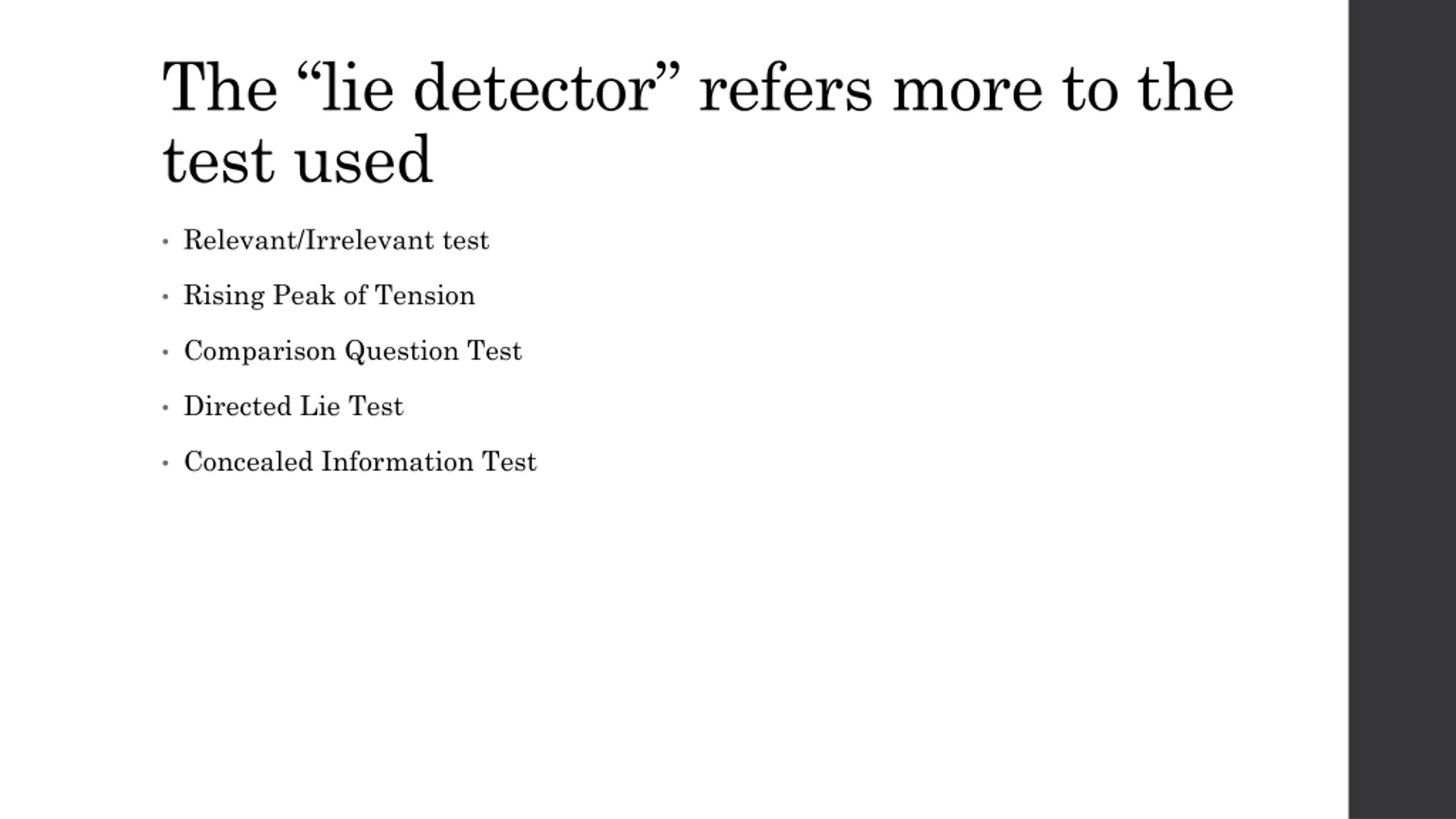 The lie detector refers more to the test used Relevant/Irrelevant test Rising Peak of Tension Comparison Question Test Directed Lie Test Concealed Information Test