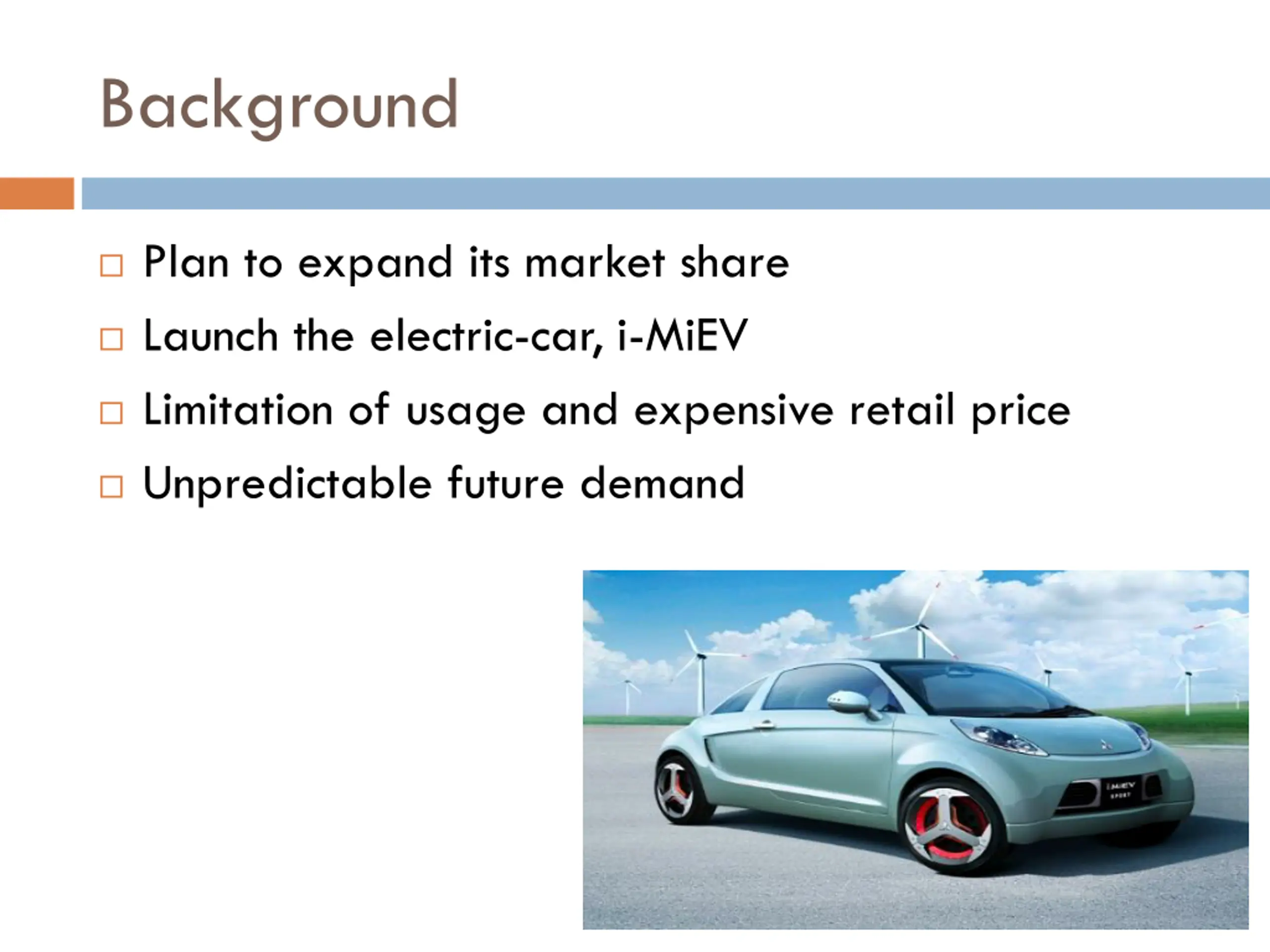 Background Plan to expand its market share Launch the electric-car, i-MiEV Limitation of usage and expensive retail price Unpredictable future demand