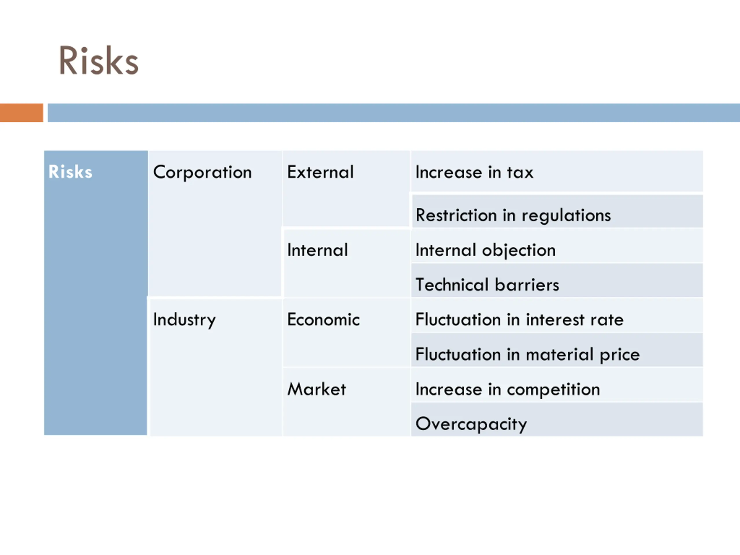 Risks Risks Corporation External Increase in tax Restriction in regulations Internal Internal objection Technical barriers Industry Economic Fluctuation in interest rate Fluctuation in material price Market Increase in competition Overcapacity