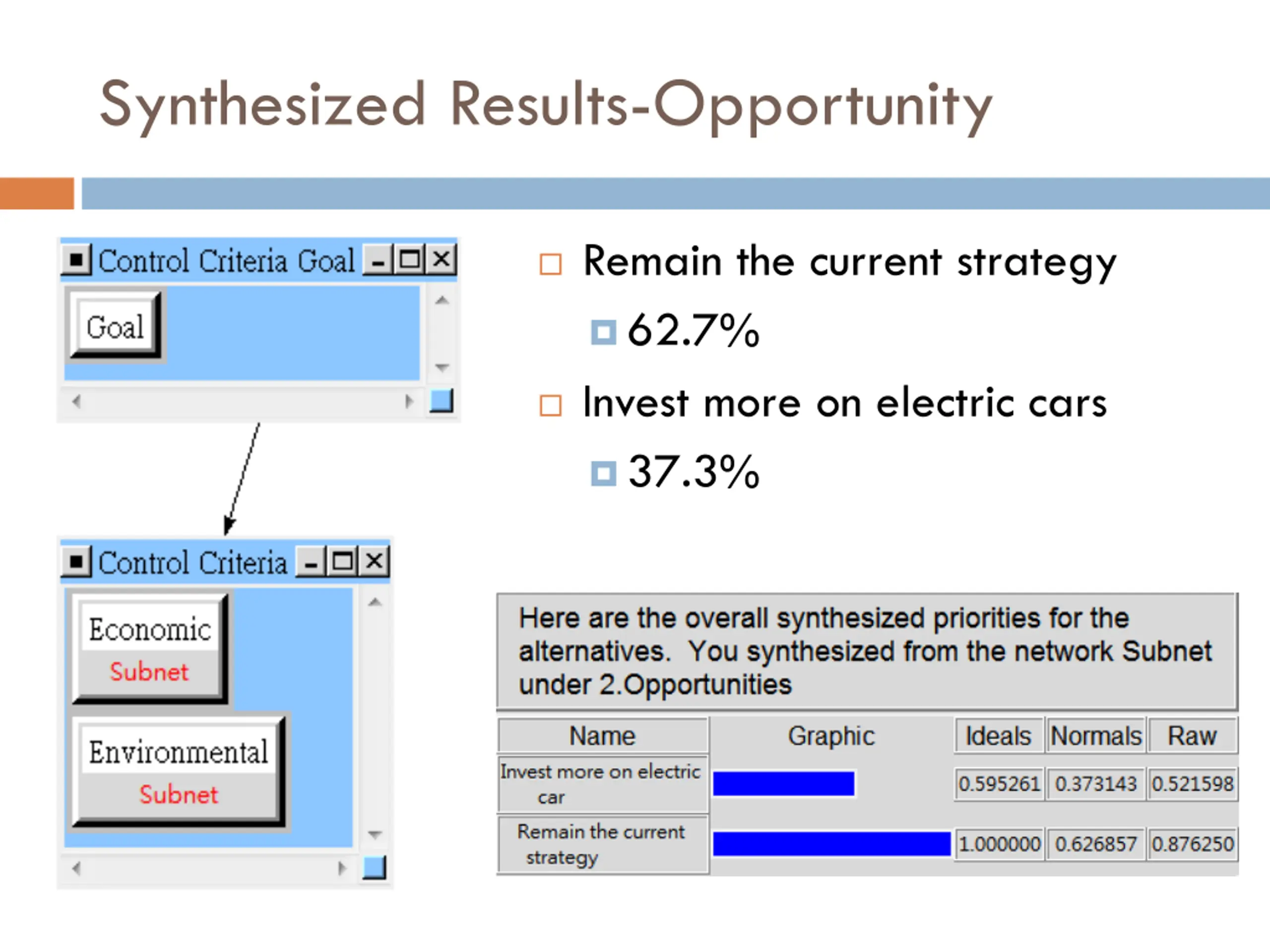 Synthesized Results-Opportunity Remain the current strategy 62.7% Invest more on electric cars 37.3%