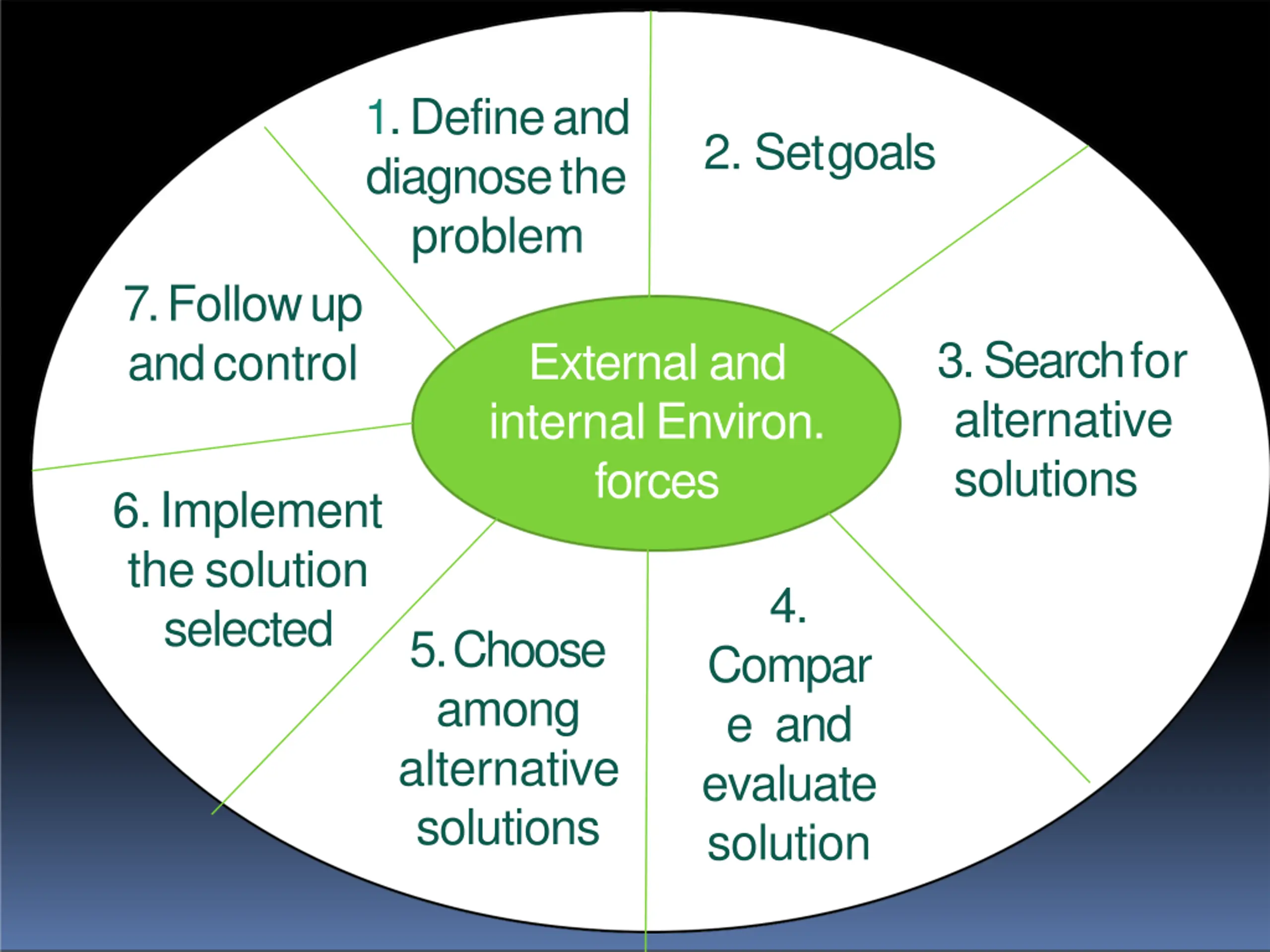 1. Defineand diagnosethe problem 2. Setgoals 7. Followup andcontrol 3. Searchfor alternative solutions External and internalEnviron. forces 6.Implement thesolution selected 4. 5.Choose among alternative solutions Compar e and evaluate solution